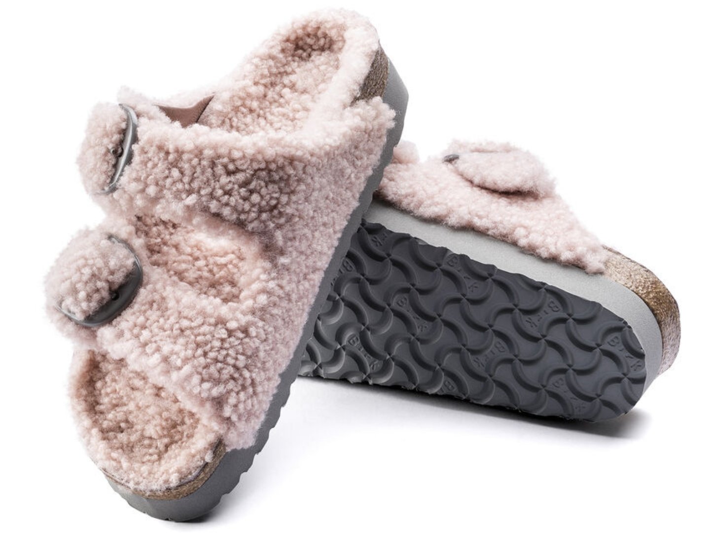 The iconic Arizona two strap sandal, now available in all over teddy shearling. Extra cozy, extra comfortable with amplified big buckles for a bold style.