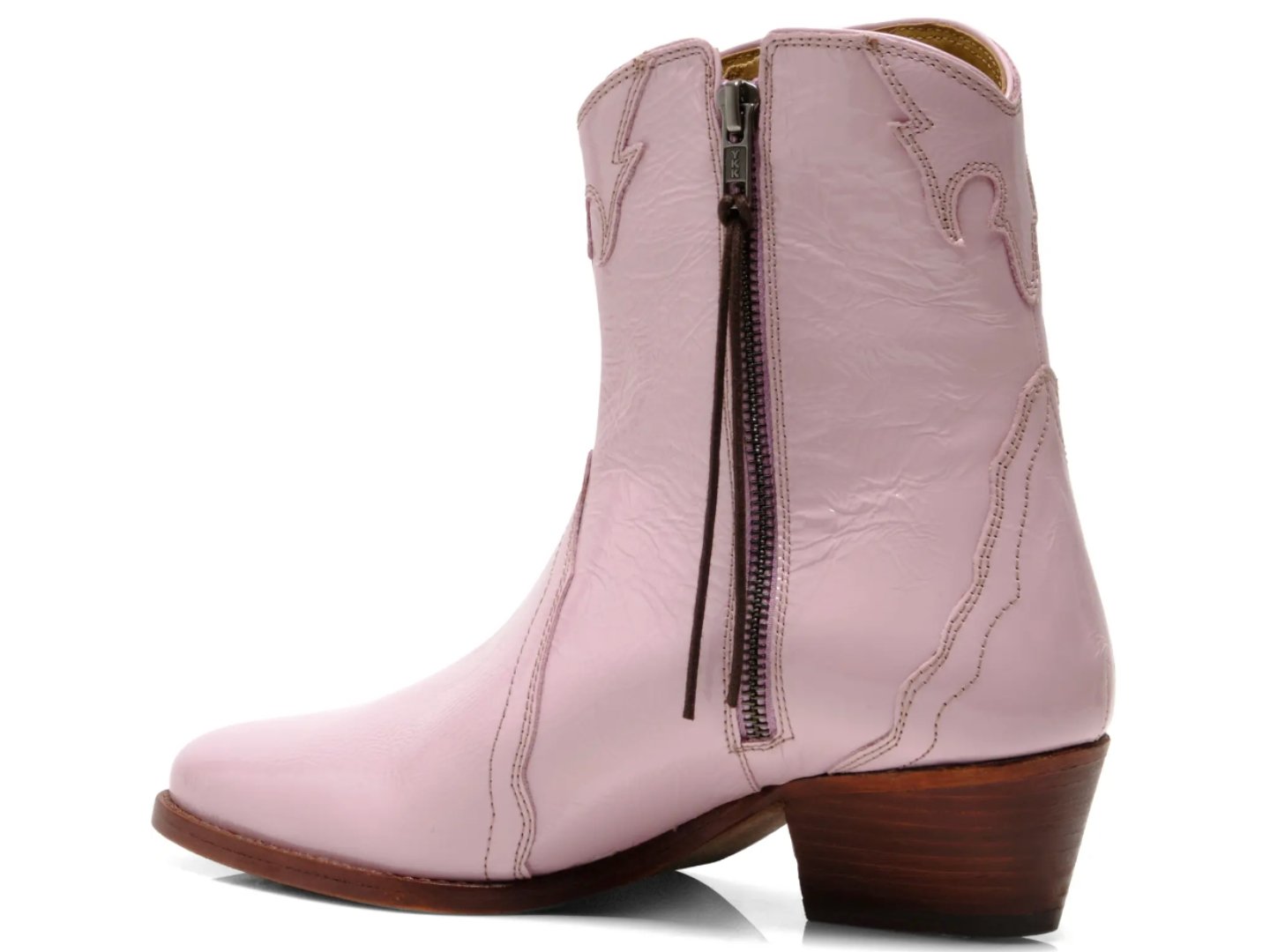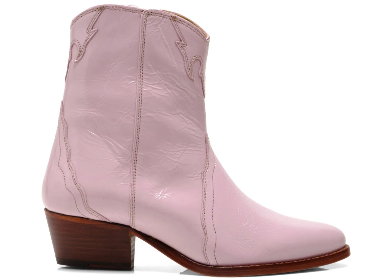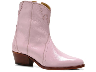 Stand out in these patent leather ankle boots in a western-inspired silhouette featuring a stacked heel and pointed toe.
