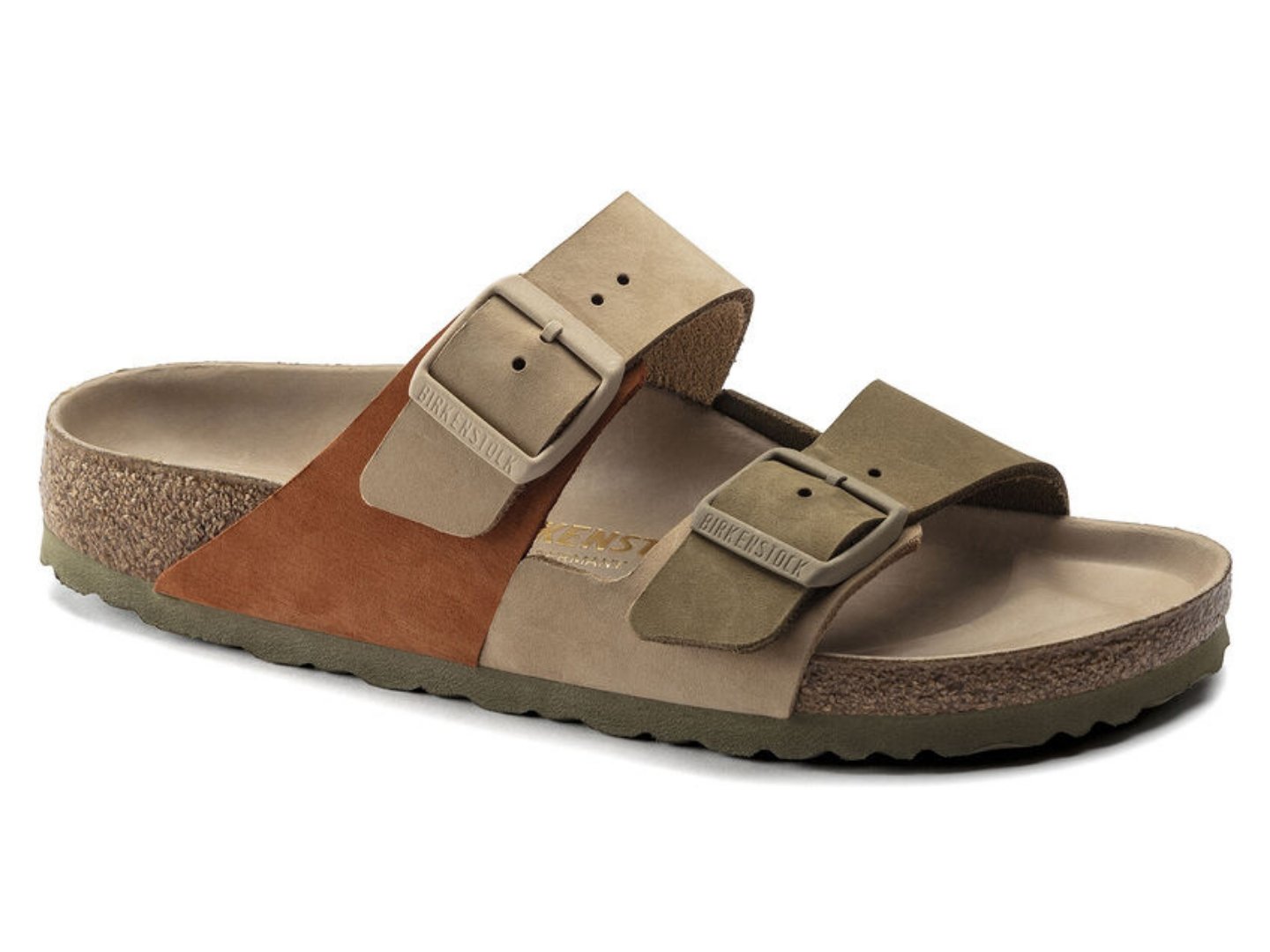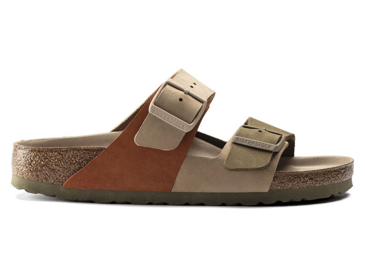 The classic Arizona gets a fresh update with a bold colorblock design. The two-strap sandal features a two tone upper, as well as a tonal footbed and buckles for a sleek and refined look. Shown in nubuck leather.