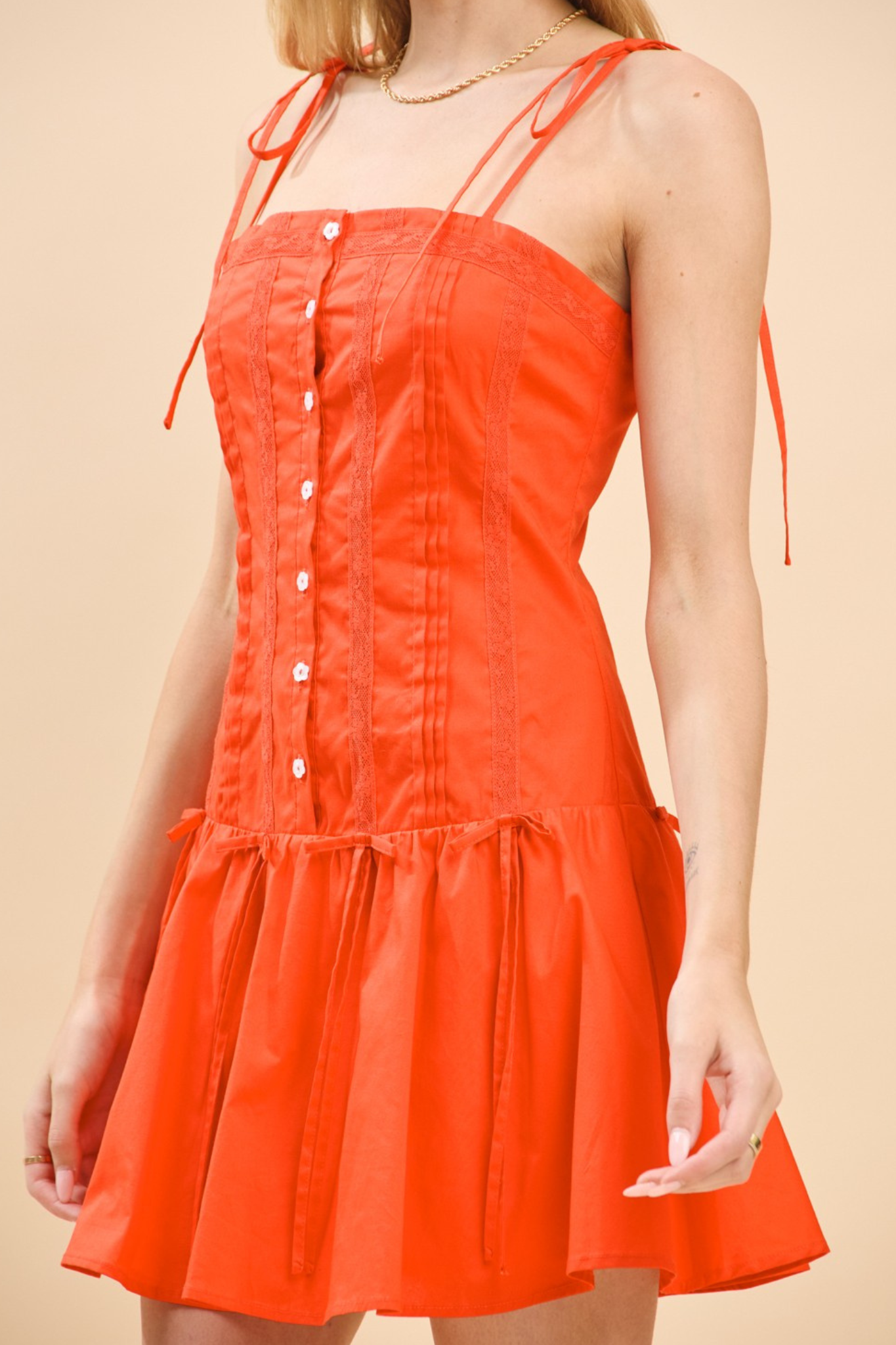 - Tide shoulder strap tube mini dress with lace trim and ribbon detail - Front button down closure - Drop waist design - Pleats, lace detail on bodice - Fully lined -Elevate your game day experience with our premium collection of game day clothing. Breeze through the weekend in our mini dress. We are obsessed with its lace trim and a little bit of a cute silhouette and more pretty silhouette. Perfect for champagne brunch with your girls teamed with kitten heels and a saddle bag for a sophisticated look that will turn heads.