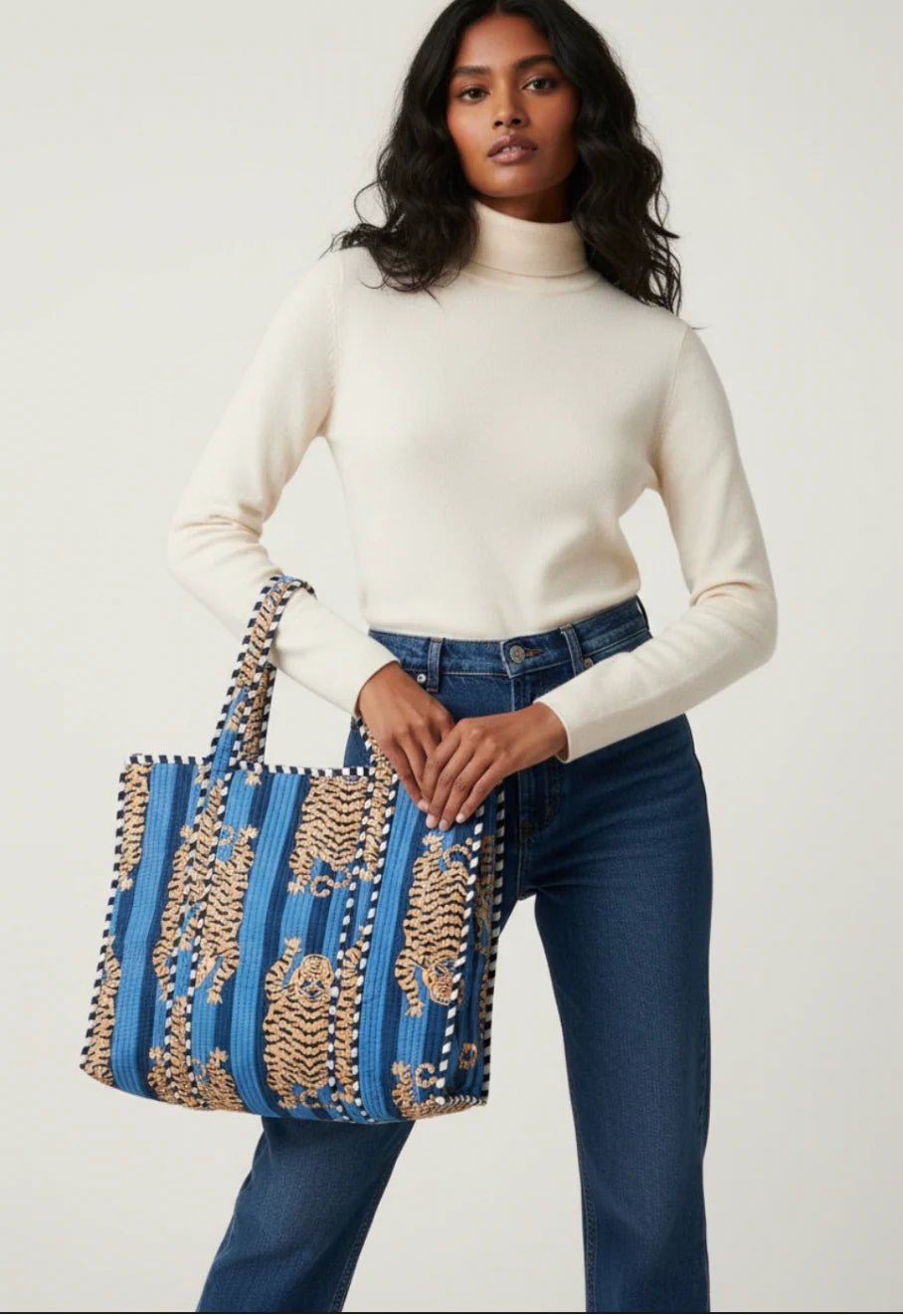Block Printed Tiger Tote in Navy Blue