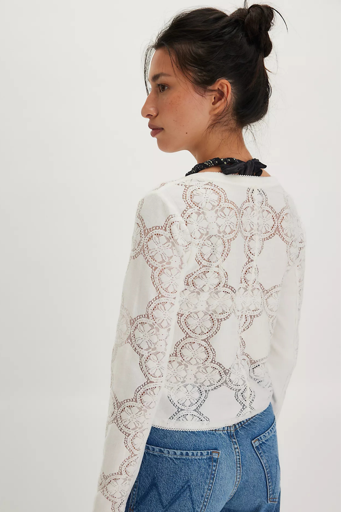 Add a dainty touch to your look with this sheer cotton-lace long sleeve, featured in a button-front style for a versatile piece that’s perfect for layering.