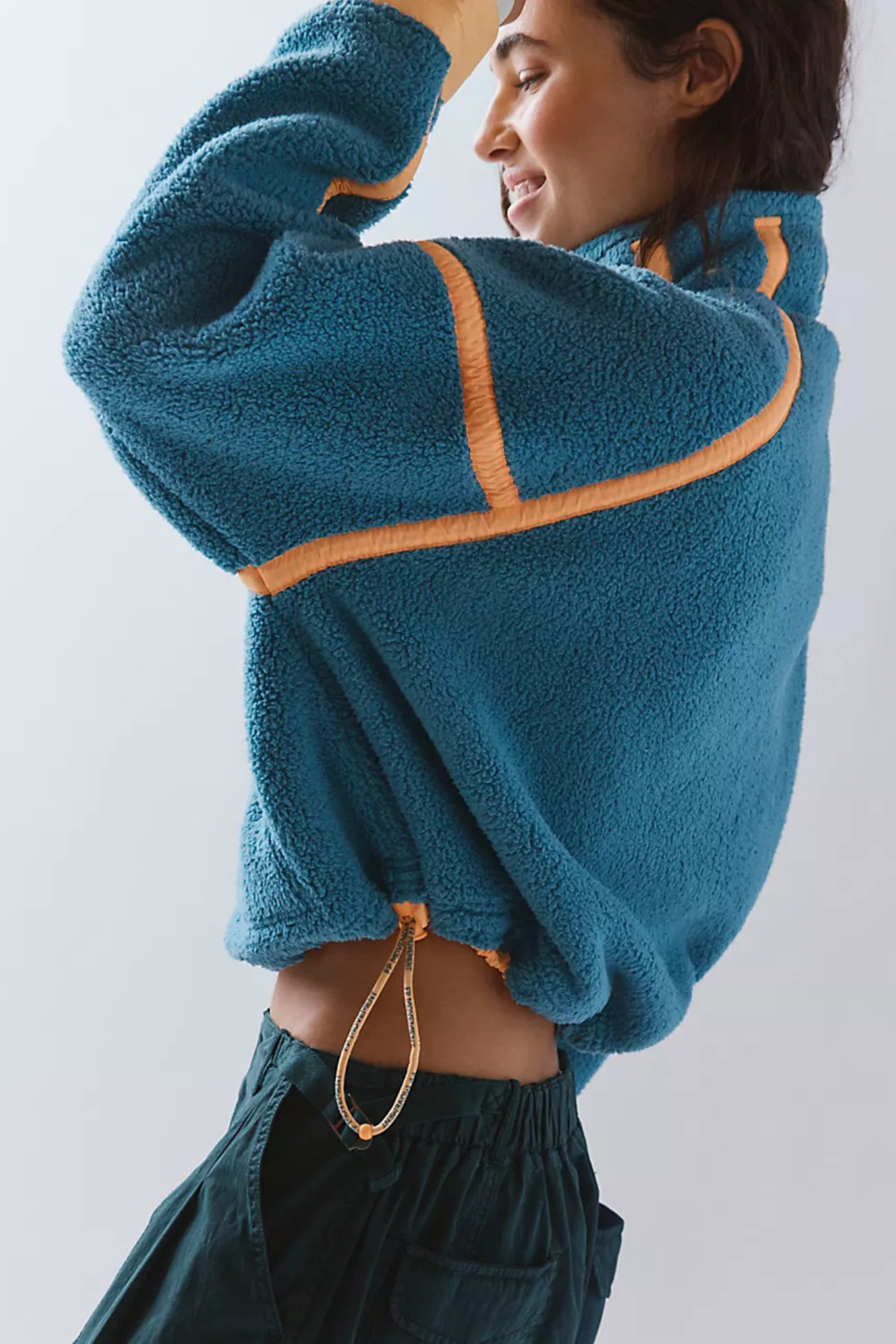 Cozy fleece pullover featuring a half-zip closure and high neckline with bold contrast seams throughout and an adjustable hemline.