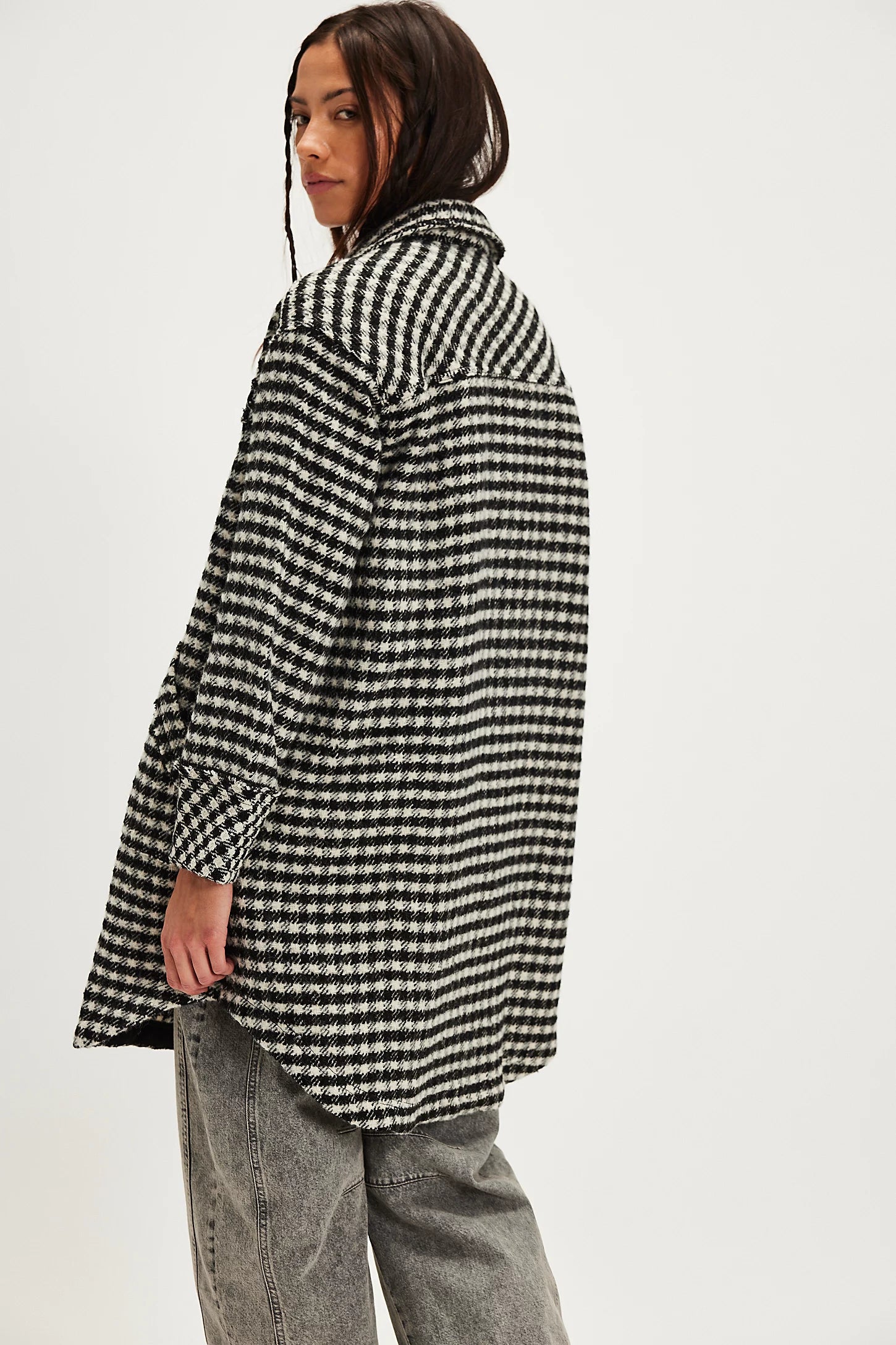 Features: Soft wool-blend, houndstooth fabrication, collared-neckline, button closures, drop-shoulder sleeves with cuffs, exaggerated patch-pocket detailing