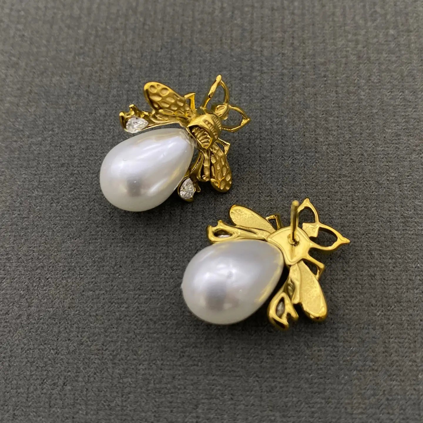 Pearl & CZ Bee Earrings in Gold by Mio Queen