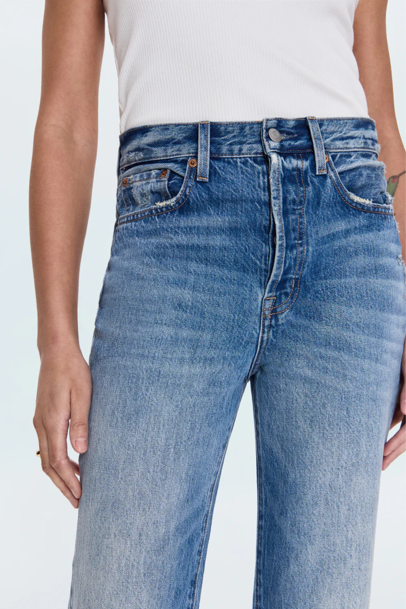 The best-selling straight leg that gets it right. Cassie's super high rise creates a sculpted silhouette that's both commanding and comfortable, expertly scaled for smaller frames. The classic straight leg falls to a full-length hem, finished with a 31" inseam for perfect proportions. Crafted from our rigid denim in Serpentine Vintage, a medium blue wash with authentic vintage character and natural fading that feels effortlessly lived-in.