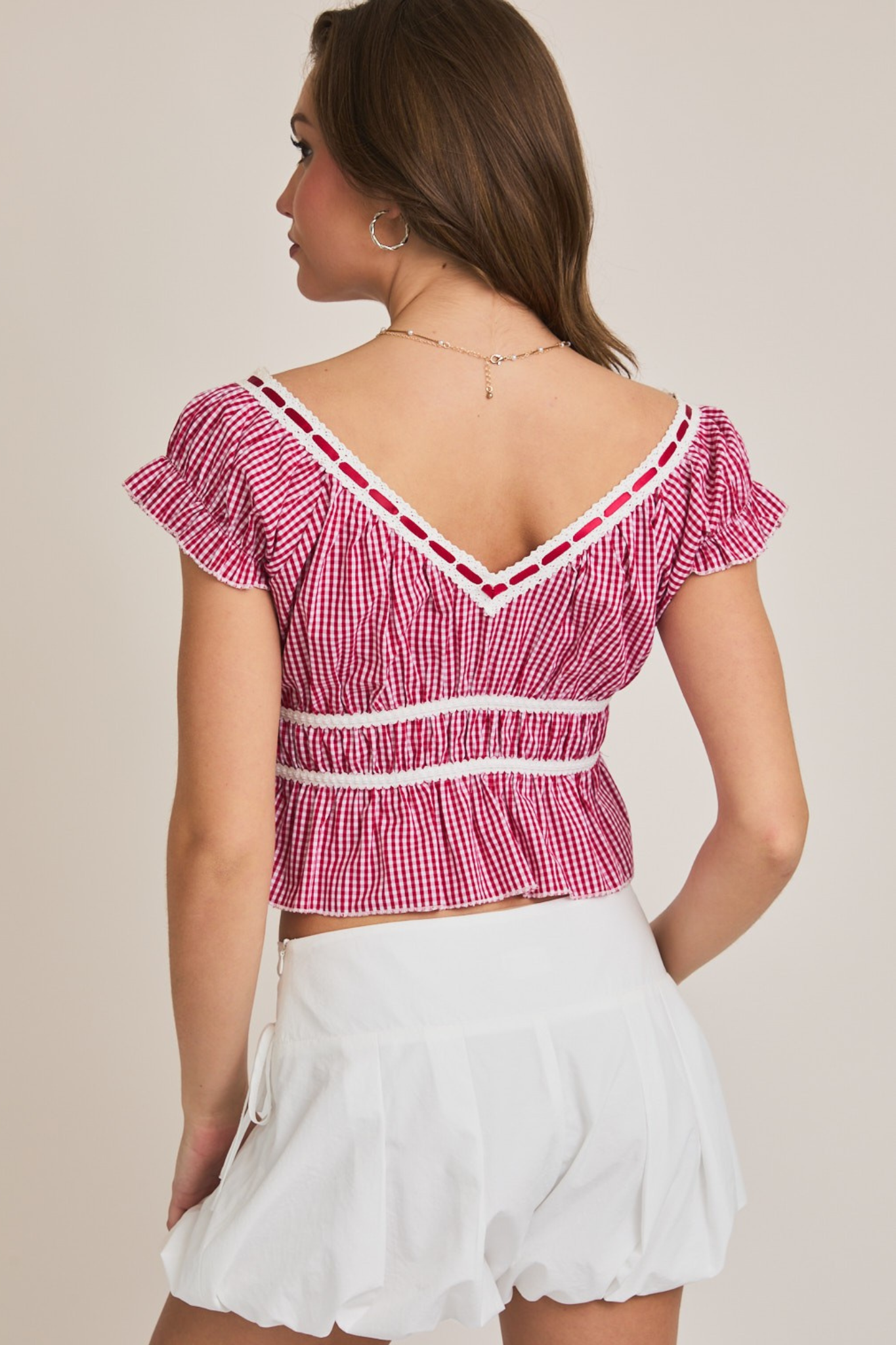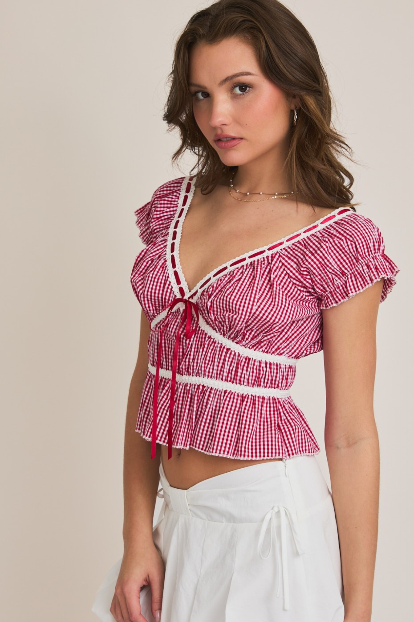 Le Lis: v-neckline top with lace trim in red-white gingham style #: PT6019