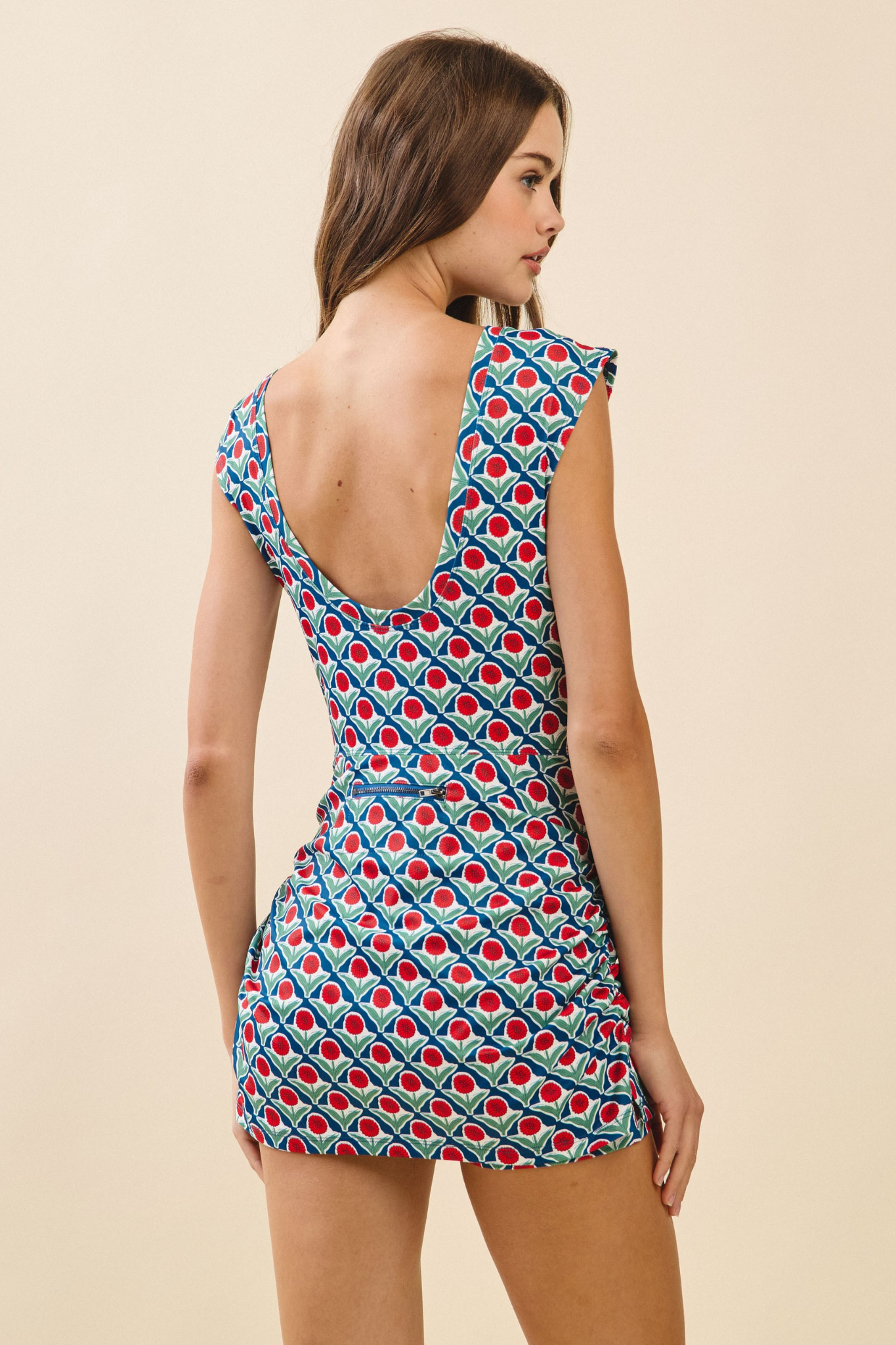 This sleeveless dress features a bold retro floral print, built-in shorts, and a wrap-style skirt overlay. Model Size + Fit: Model height: 5'11" Dress size: Small Bust: 31.5 Waist: 23.5 Hips: 35