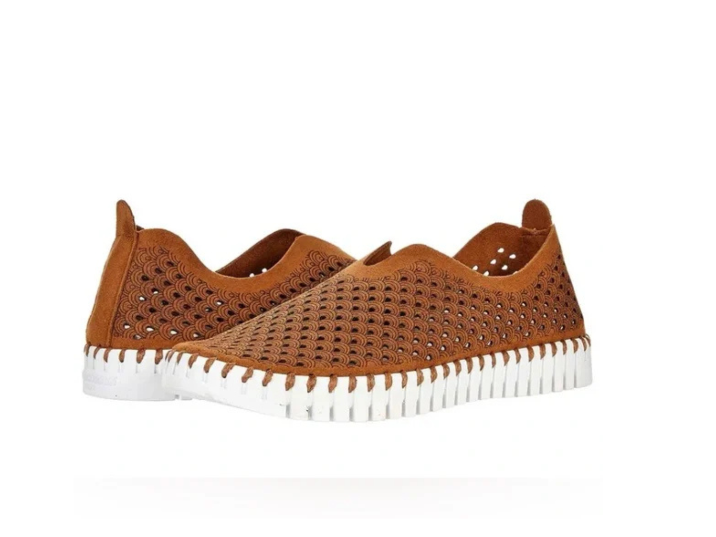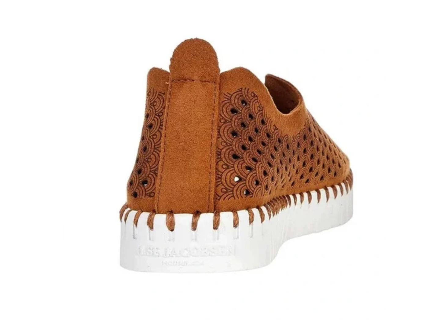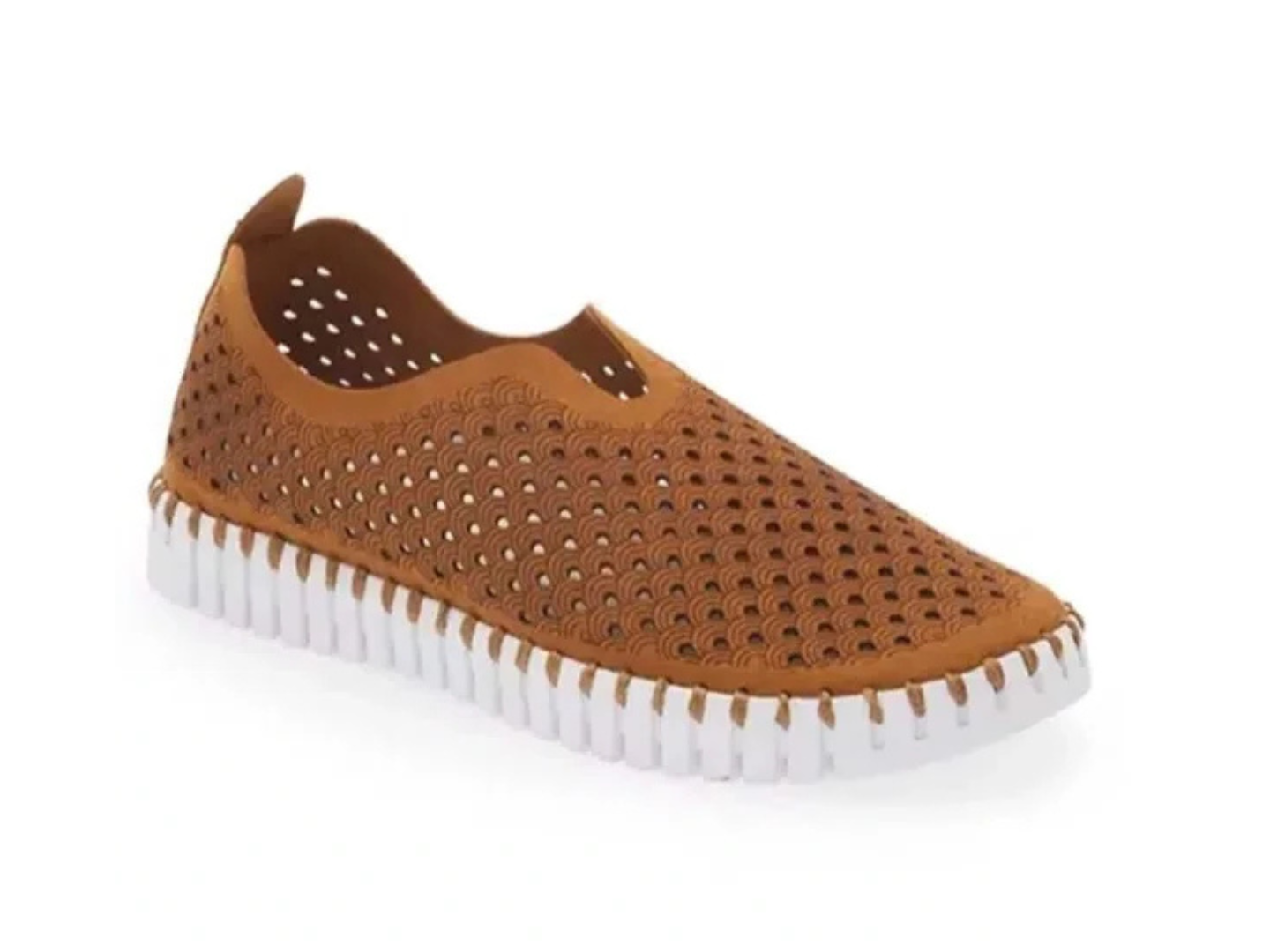 Scalloped embossing frames all-over teardrop perforations on the upper of a super-comfortable slip-on sneaker that's whipstitched to a flexible rubber sole.