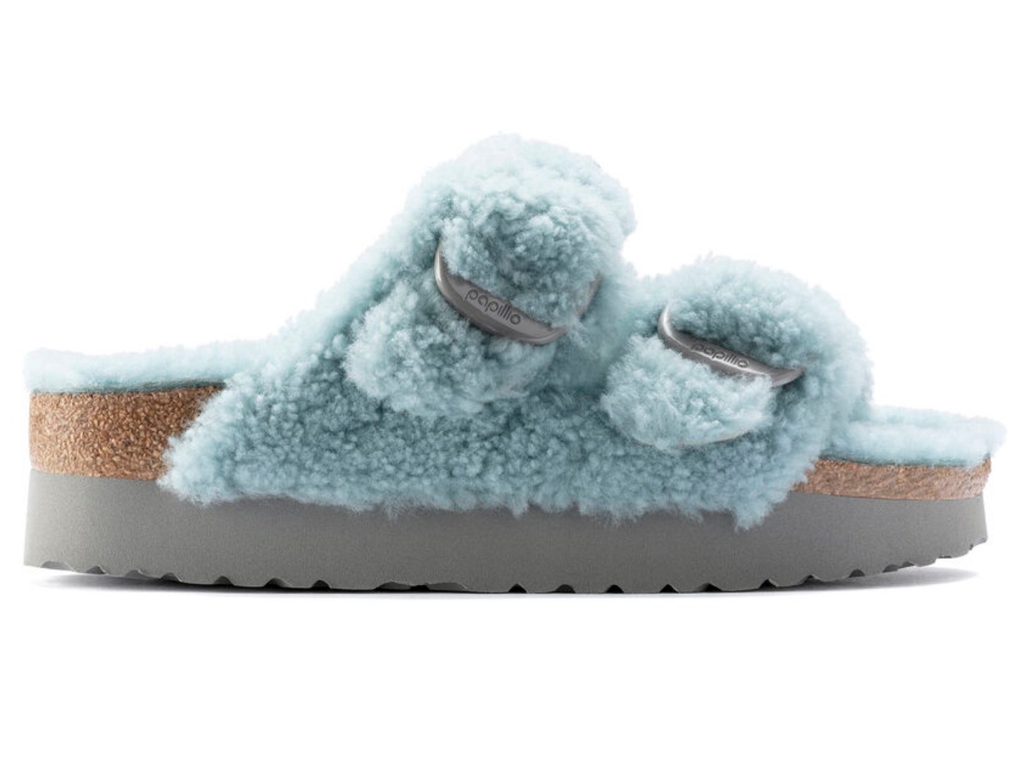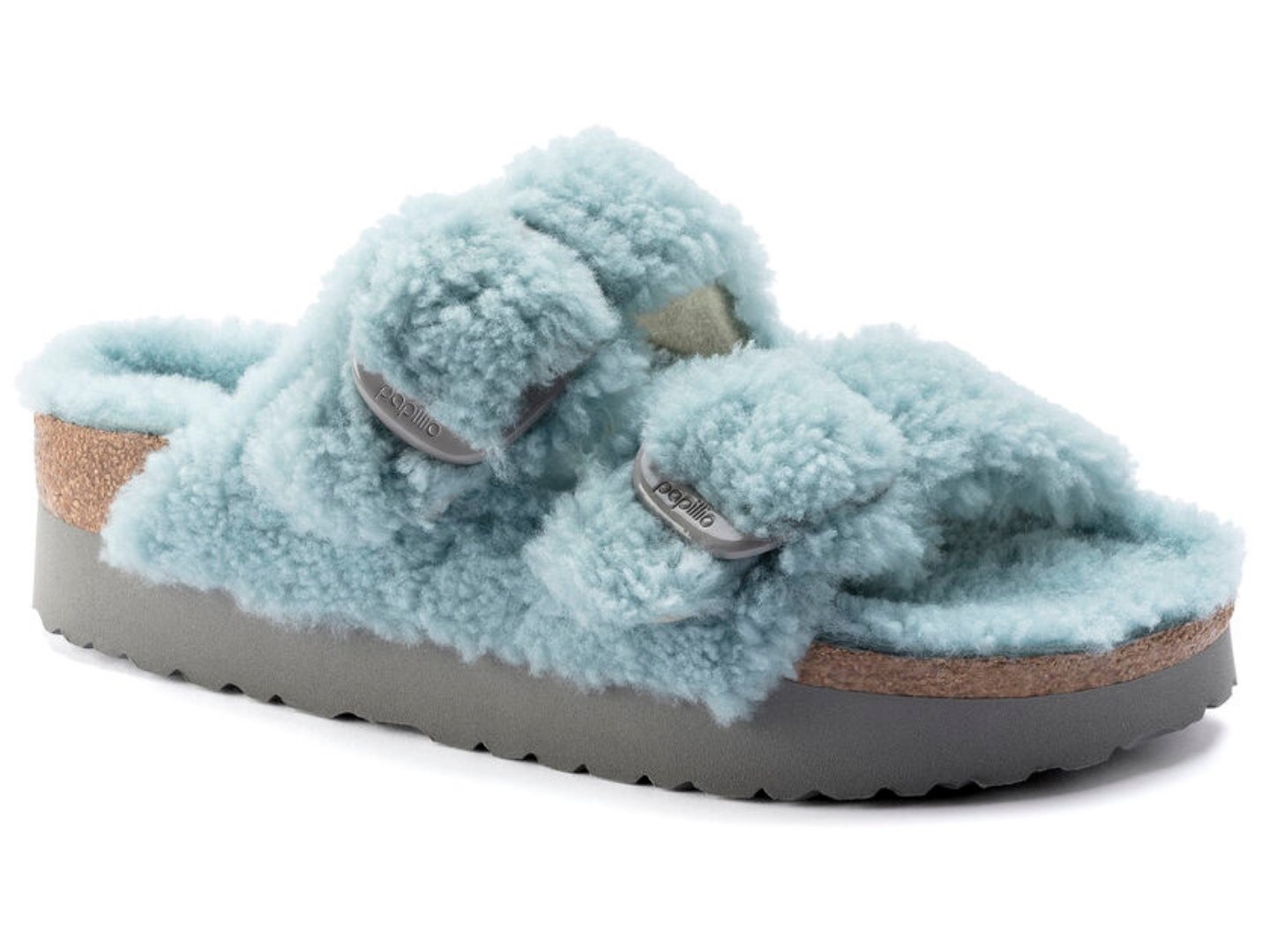 The iconic Arizona two strap sandal, now available in all over teddy shearling. Extra cozy, extra comfortable with amplified big buckles for a bold style.