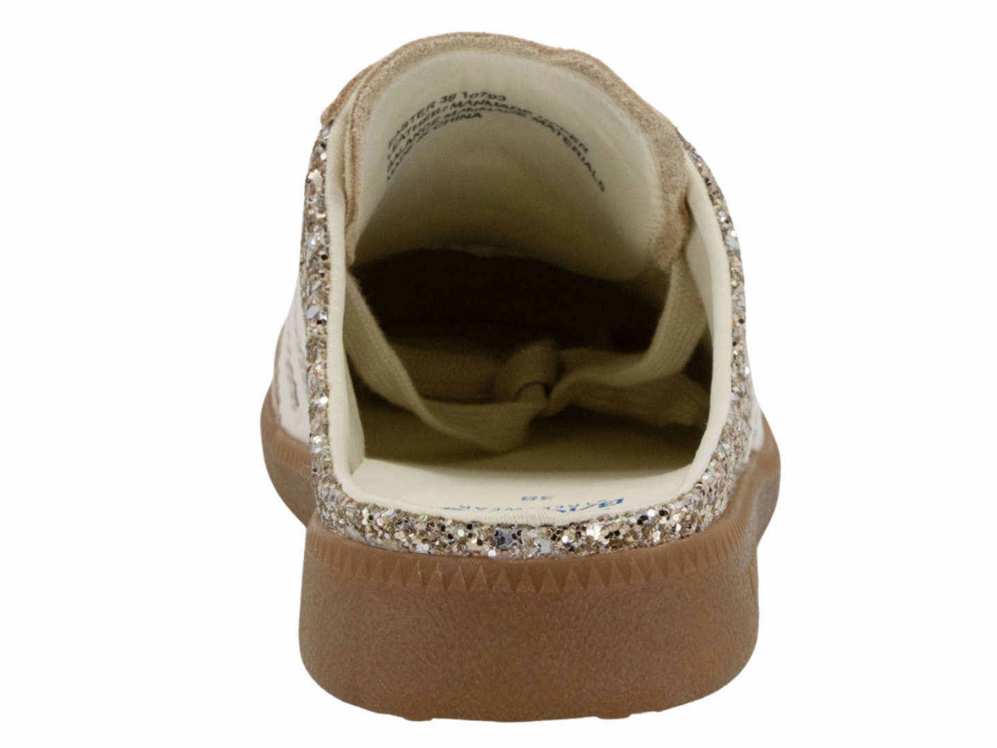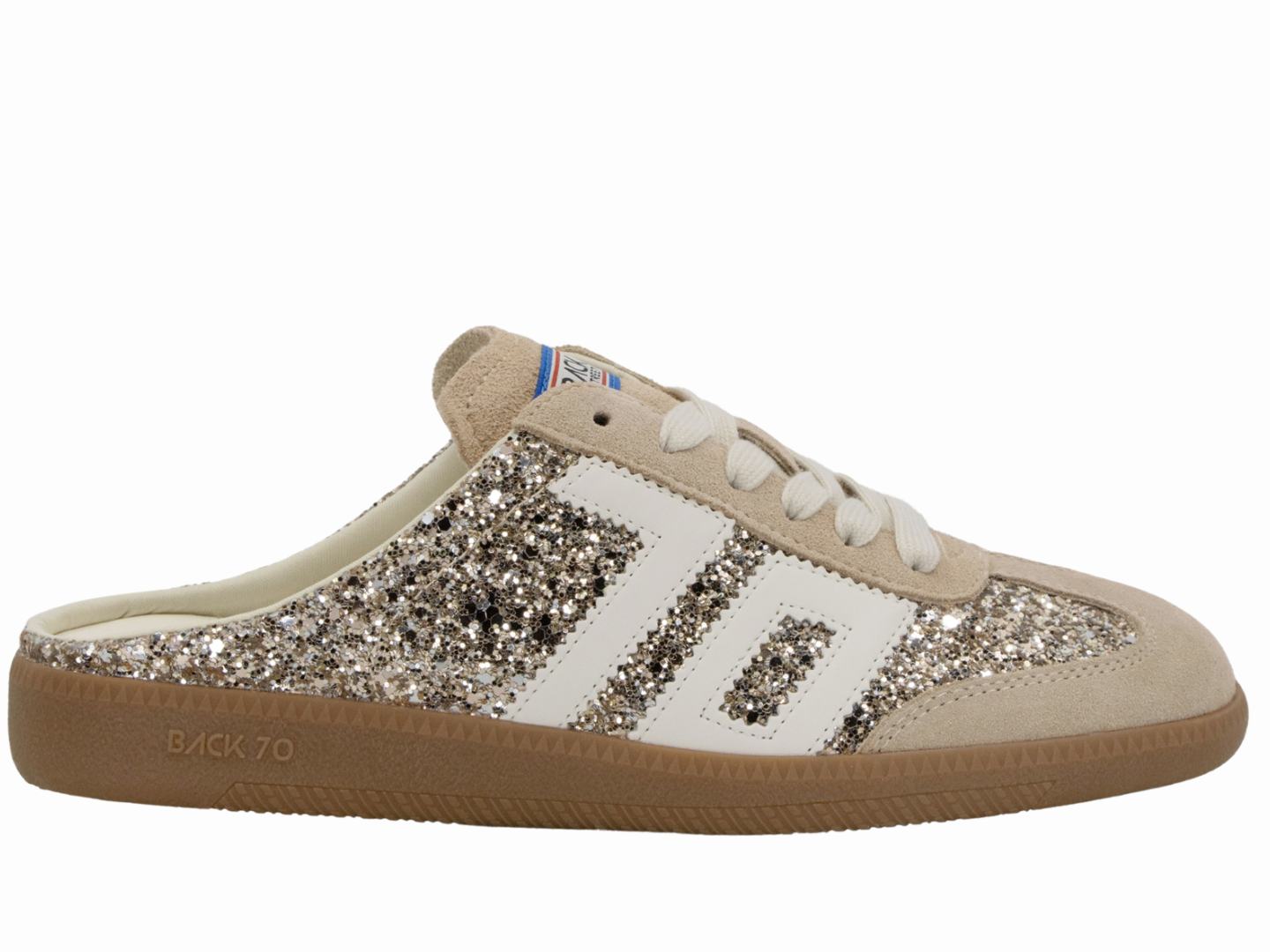 The Back 70 glitter mule brings sparkle to everyday style with a distinctly feminine, boho edge. Designed in shimmering gold glitter, this effortless sneaker mule blends laid-back charm with the brand¿s signature vintage detailing. The open-back silhouette adds ease and personality, while subtle suede trims and retro accents keep it unmistakably Back 70. A perfect mix of glamour and casual cool, it¿s made for the girlie girl who loves her sneakers with a little shine.