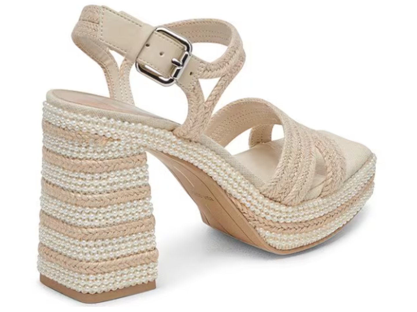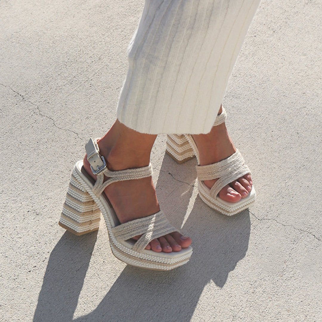 More is more. ANIRA PEARL is embellished to the nines. Style this two-toned platform sandal with tailored shorts, denim, or even with a fun and flirty bridal look.