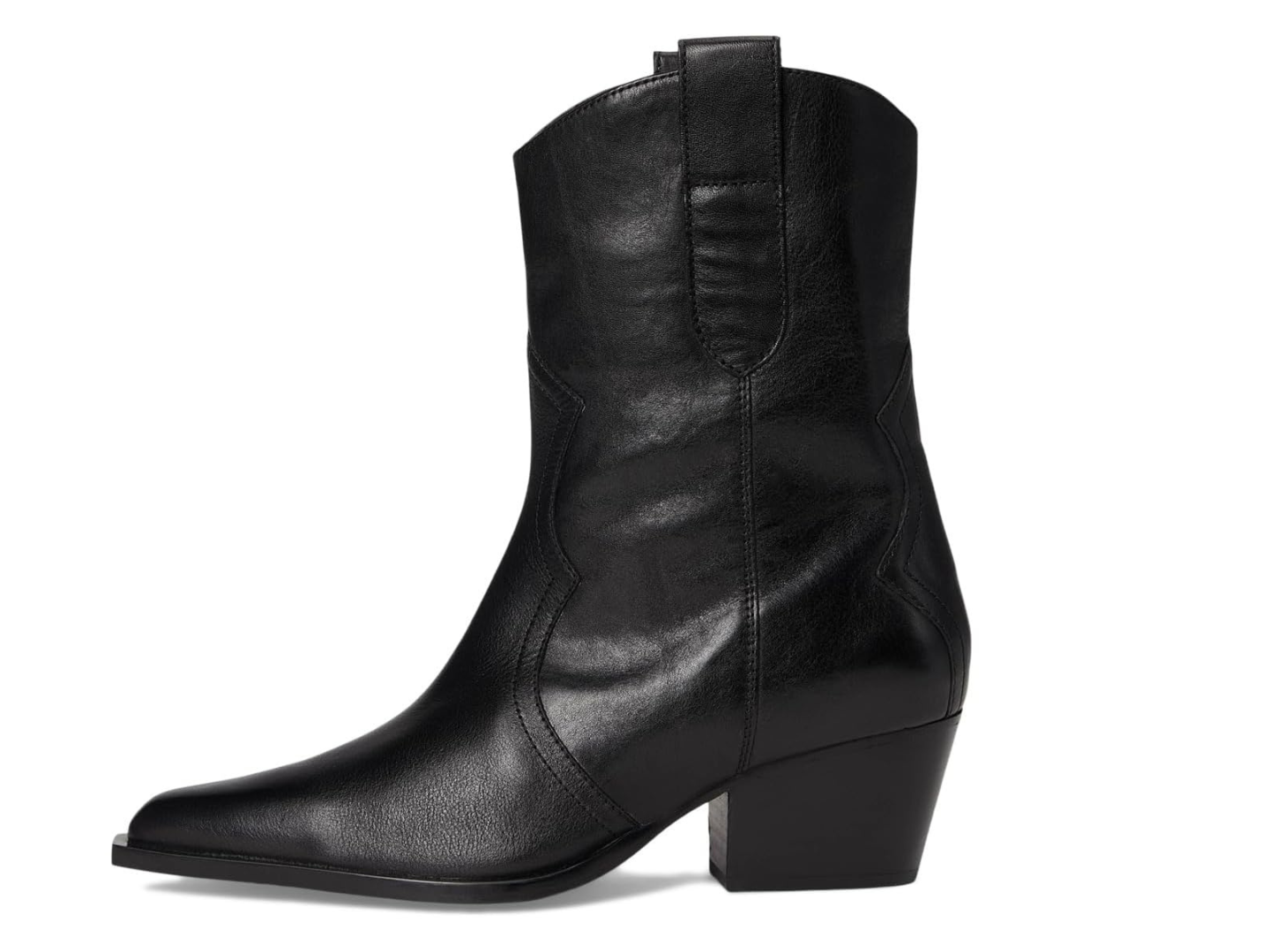 Features: Ankle length, pull-on style, leather uppers, pointed toe, Western-style stitching, dipped toplines, pull straps, block heel