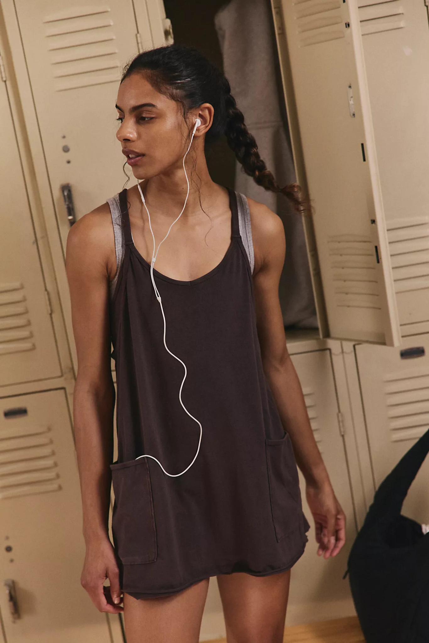 Features: Soft fabrication, lightweight design, scoop-neckline, thin shoulder straps, racerback detail with zippered pocket, oversized patch pockets at front, lined interior with shorts piecing at bottom