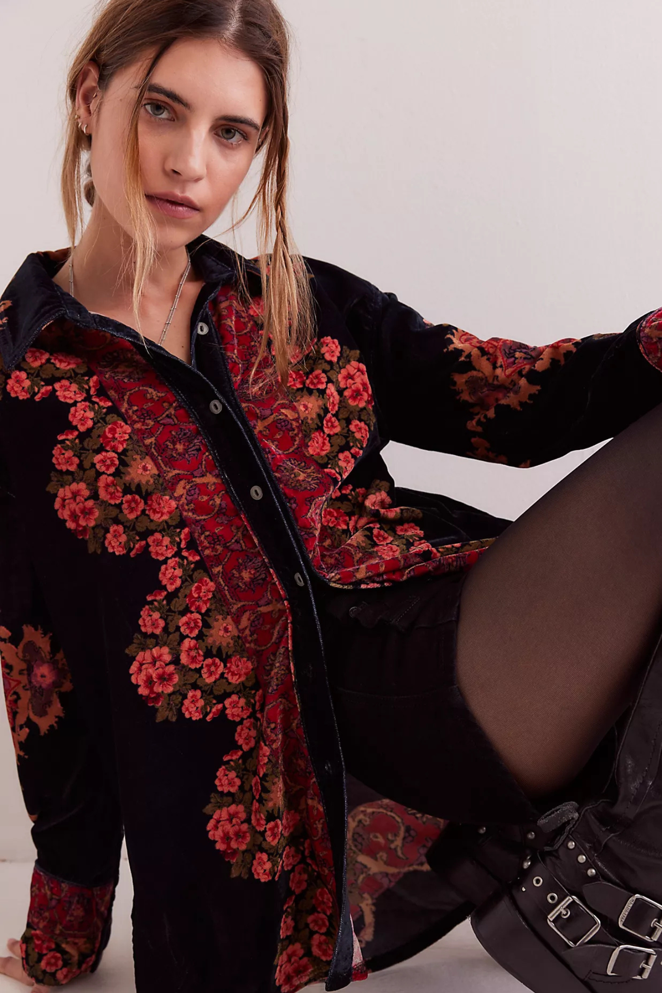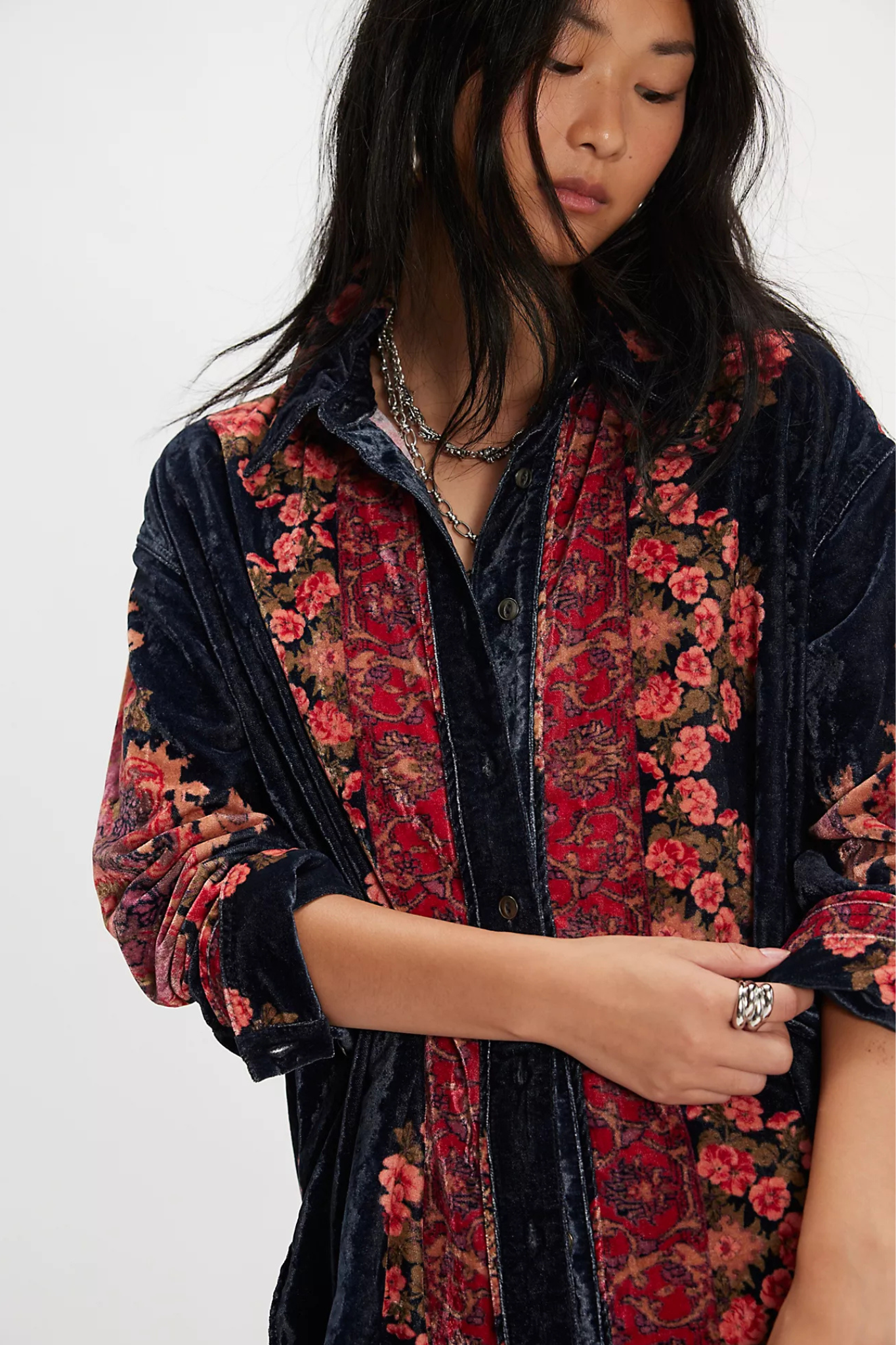 Features: Soft velvet fabrication, contrast floral print, dropped shoulders, cuffed long-sleeves, collared-neckline, shirttail hem, button closures