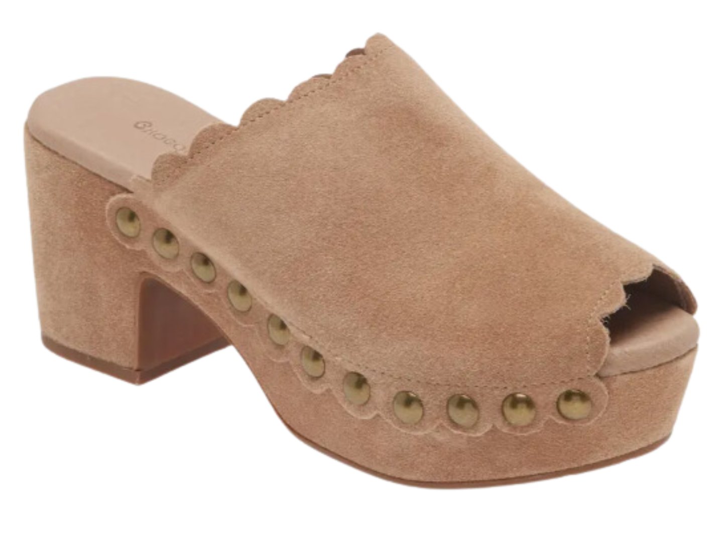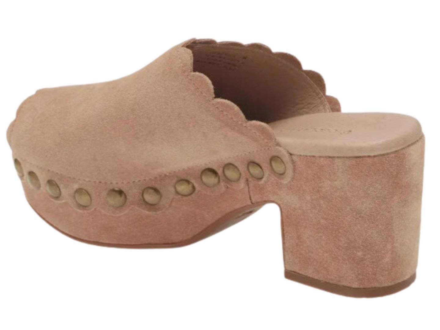 Shiny studs punctuate the chunky platform of a stylish sandal in scallop-trimmed suede.