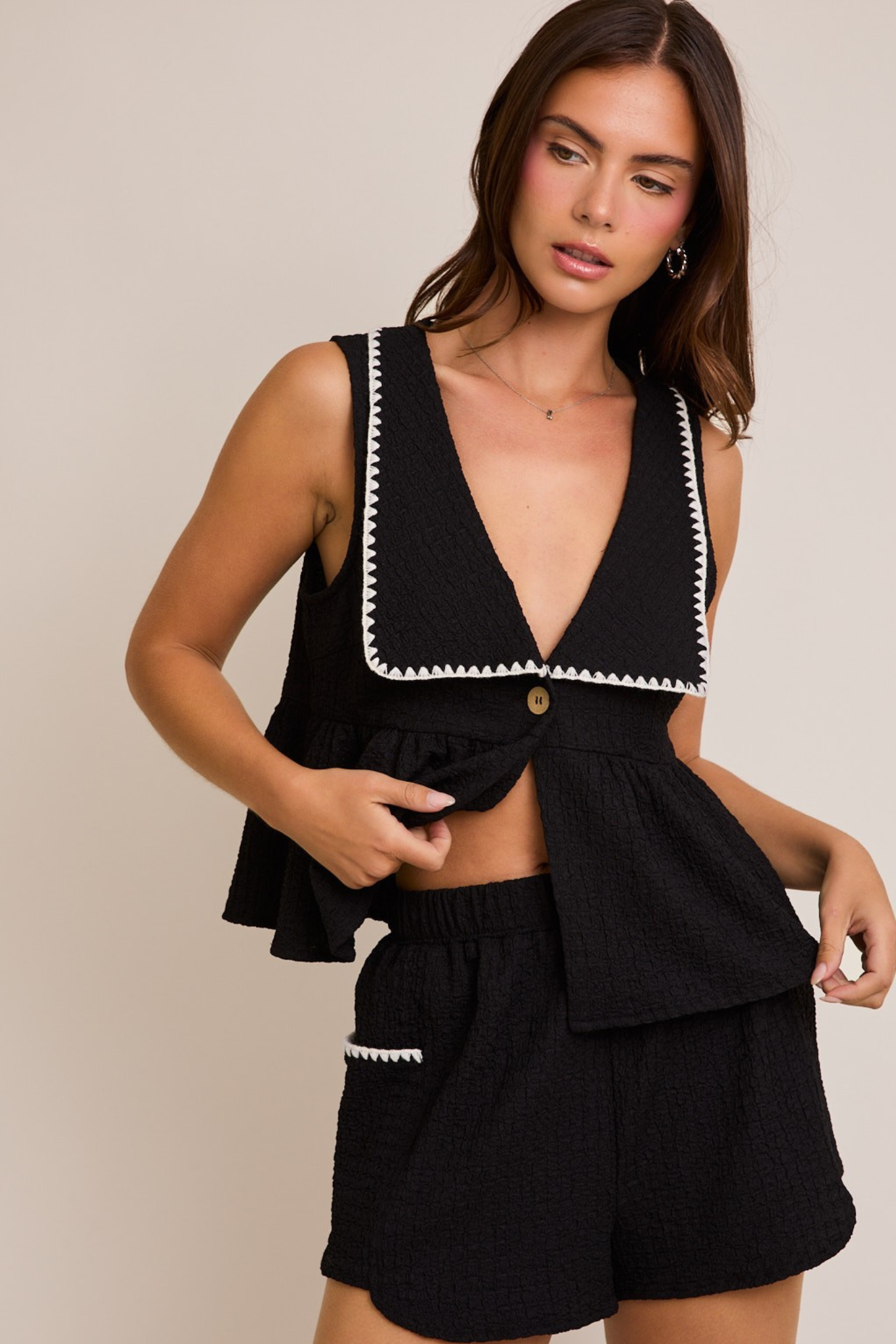 Stitched Vest and Drop Pocket Shorts Set in Black