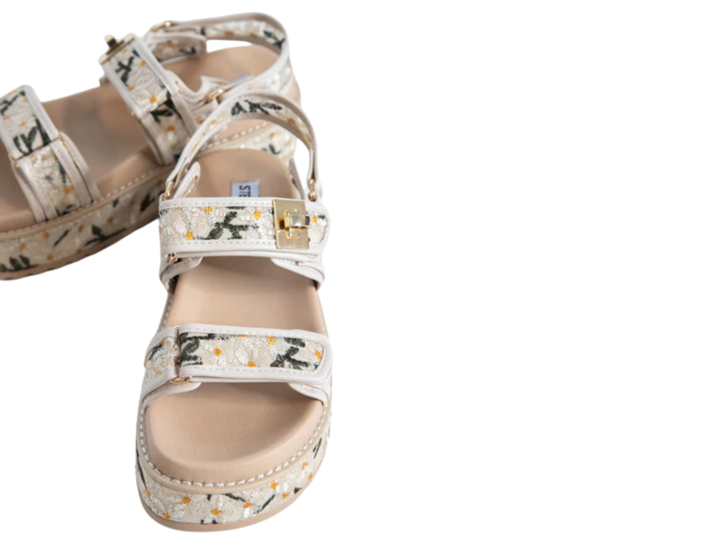 Step into style with the Big Mona Platform Sandal from Steve Madden. Made with embroidered floral fabric and featuring adjustable velcro straps, this sandal adds a playful touch to any outfit. The back strap ensures a secure fit while the platform provides extra height!
