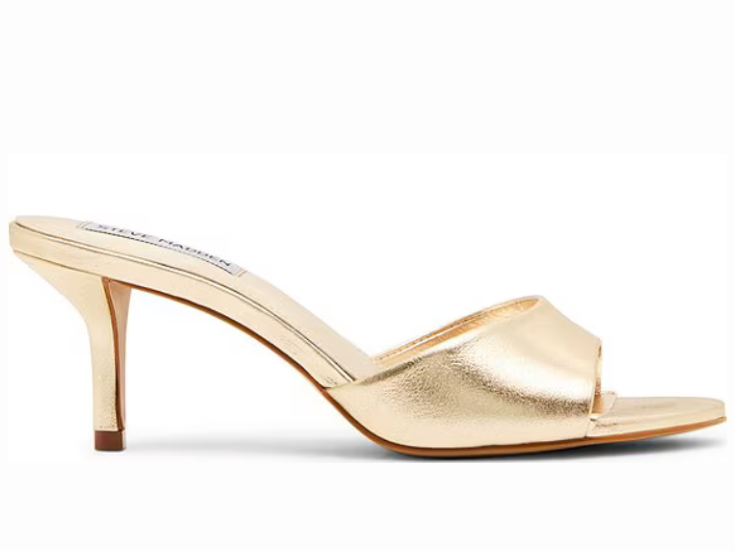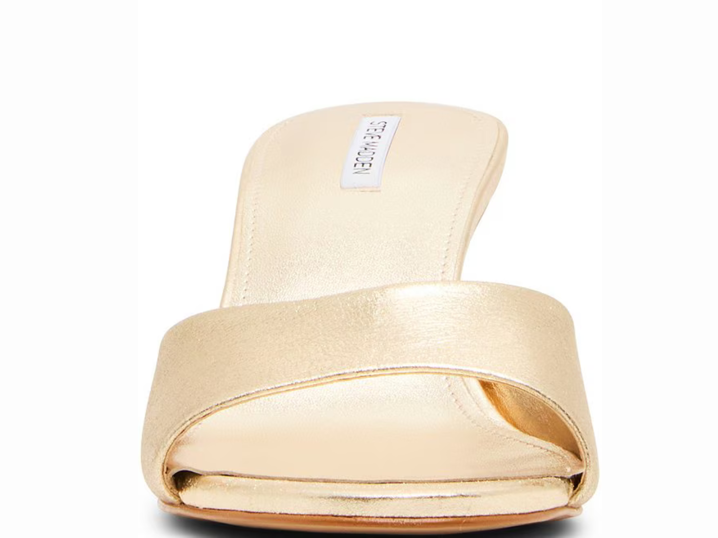 From Steve Madden, the Kendrix Metallic Leather Dress Slide Sandals feature: