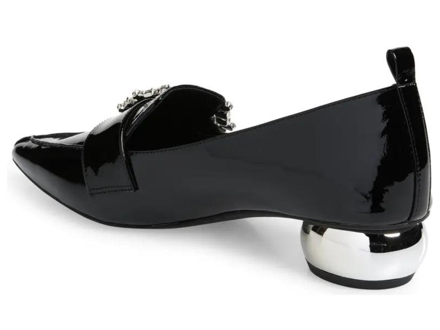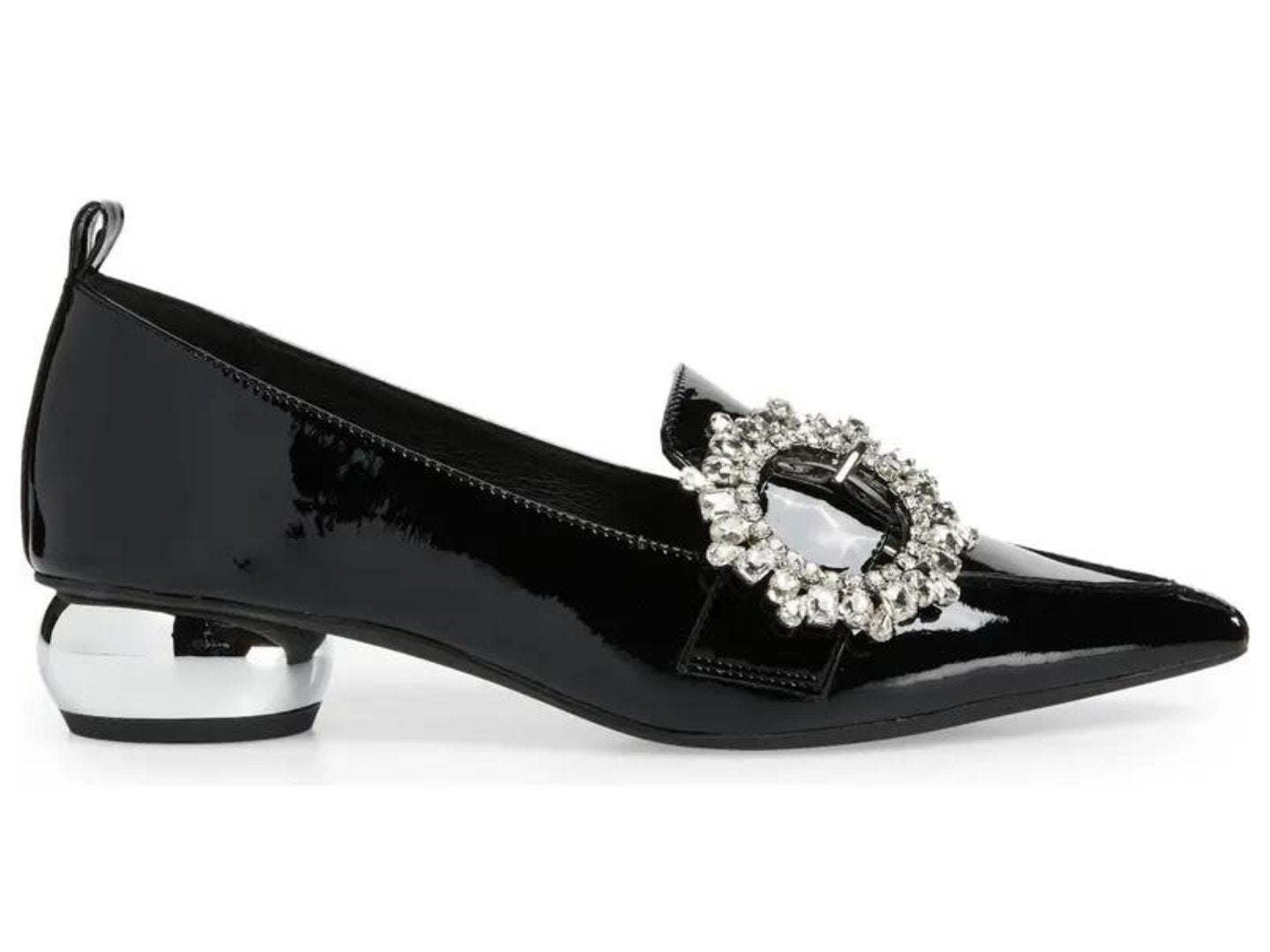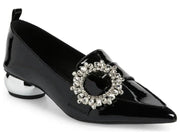 A bejeweled buckle glams up a pointed-toe pump lifted by a polished, orb-shaped heel.