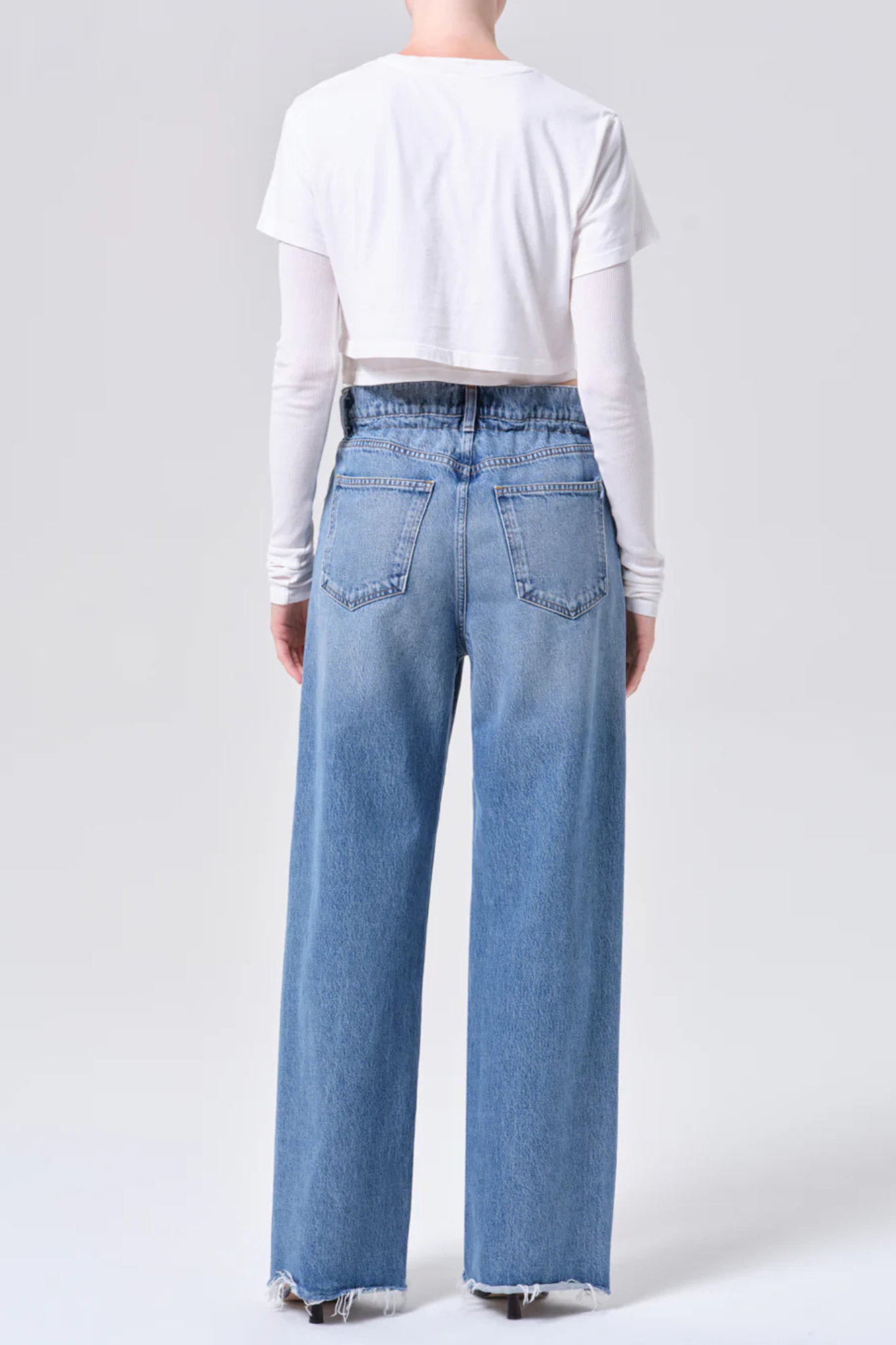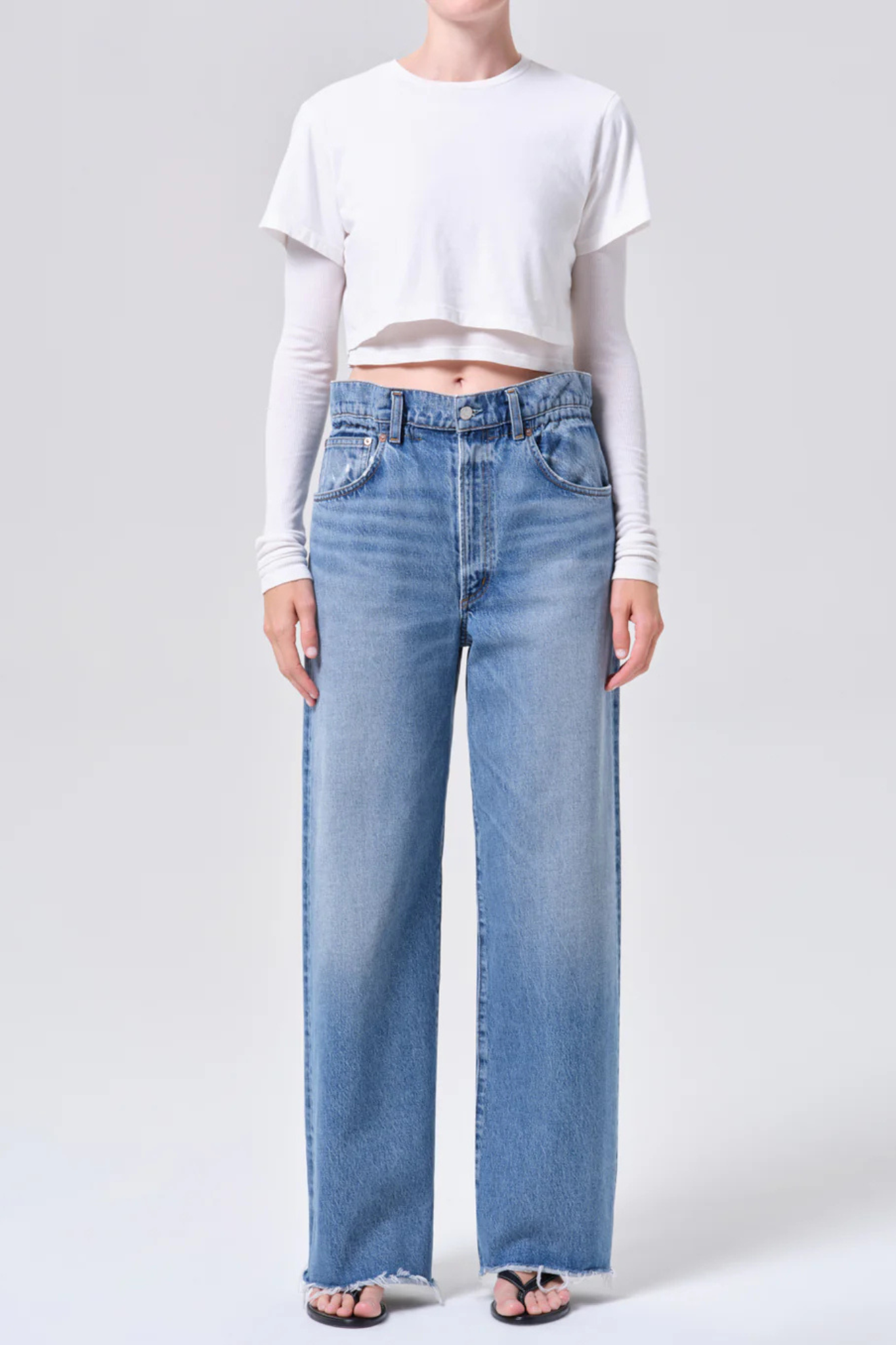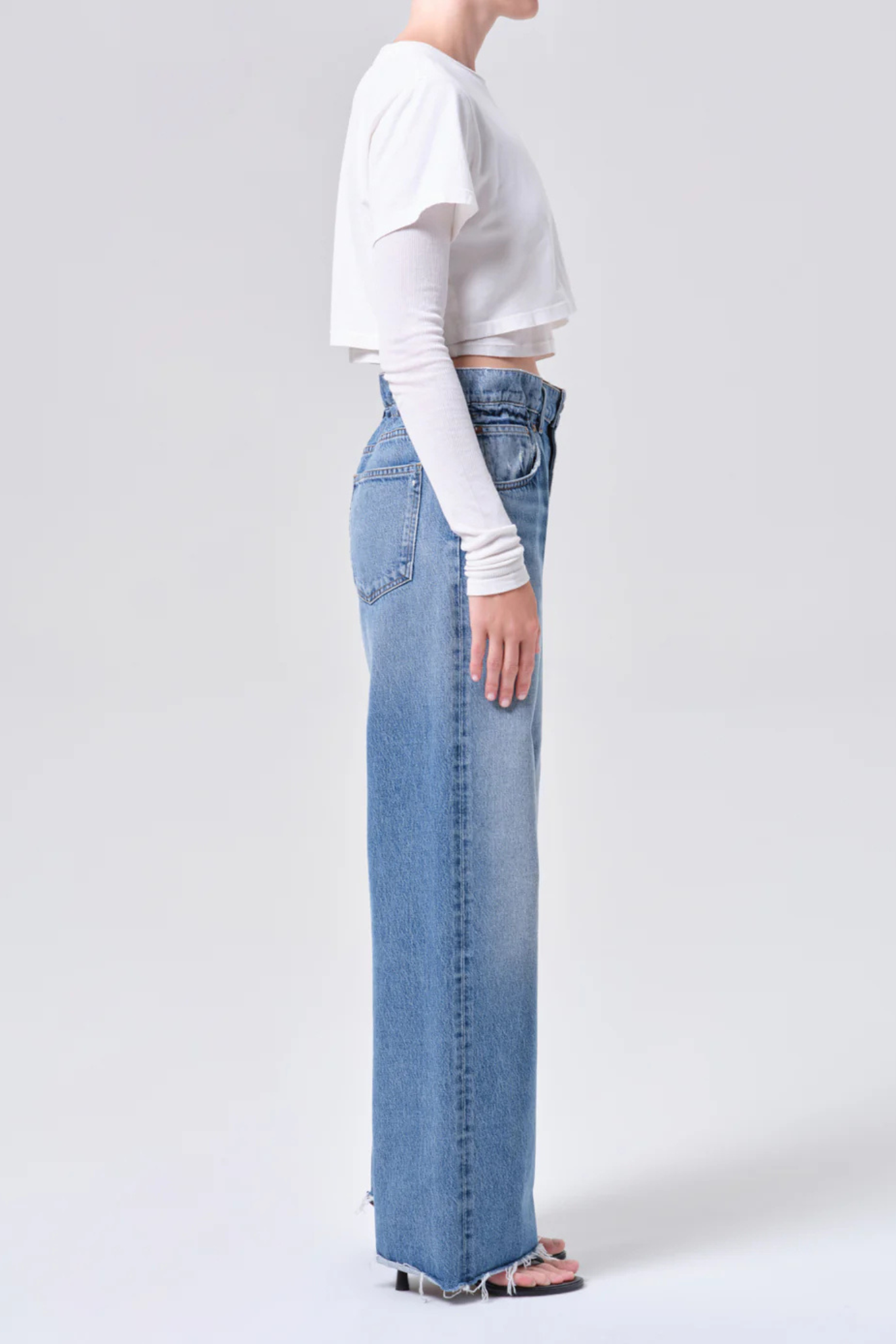 A relaxed straight leg with a softly cinched waistband, the Lyonne Jean sits high on the waist for a flattering, gathered effect. Designed in a medium vintage indigo wash, it features subtle depth and dimension that elevate this directional silhouette. The shape is easy through the leg, balancing structure with a laid-back feel and gentle volume. Crafted from a rigid non stretch cotton blend made with regenerative and recycled cotton, it offers a soft hand feel for all day wearability while maintaining its sculpted form.