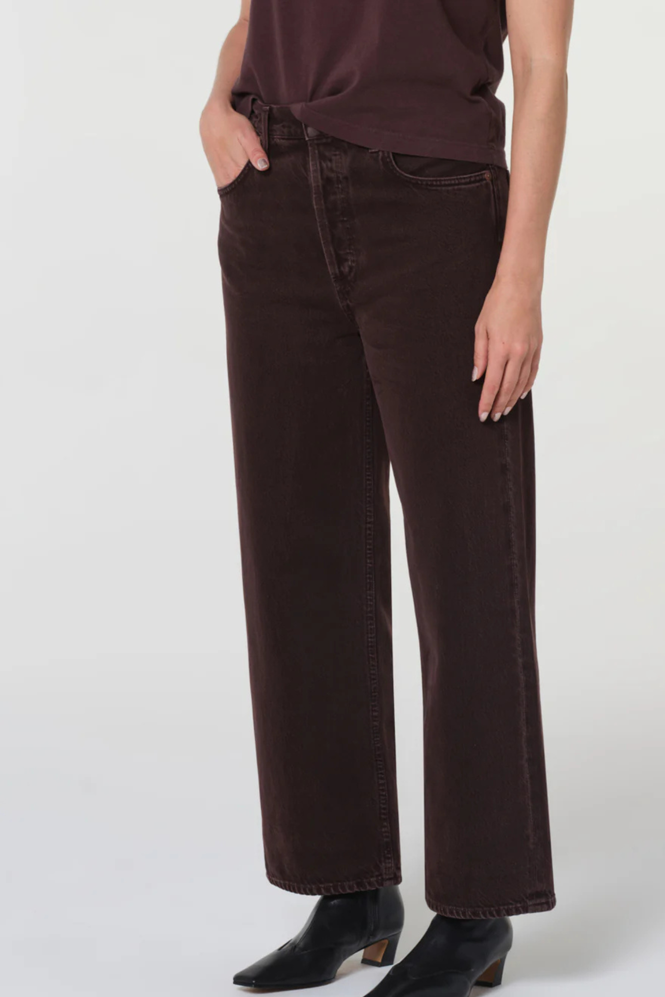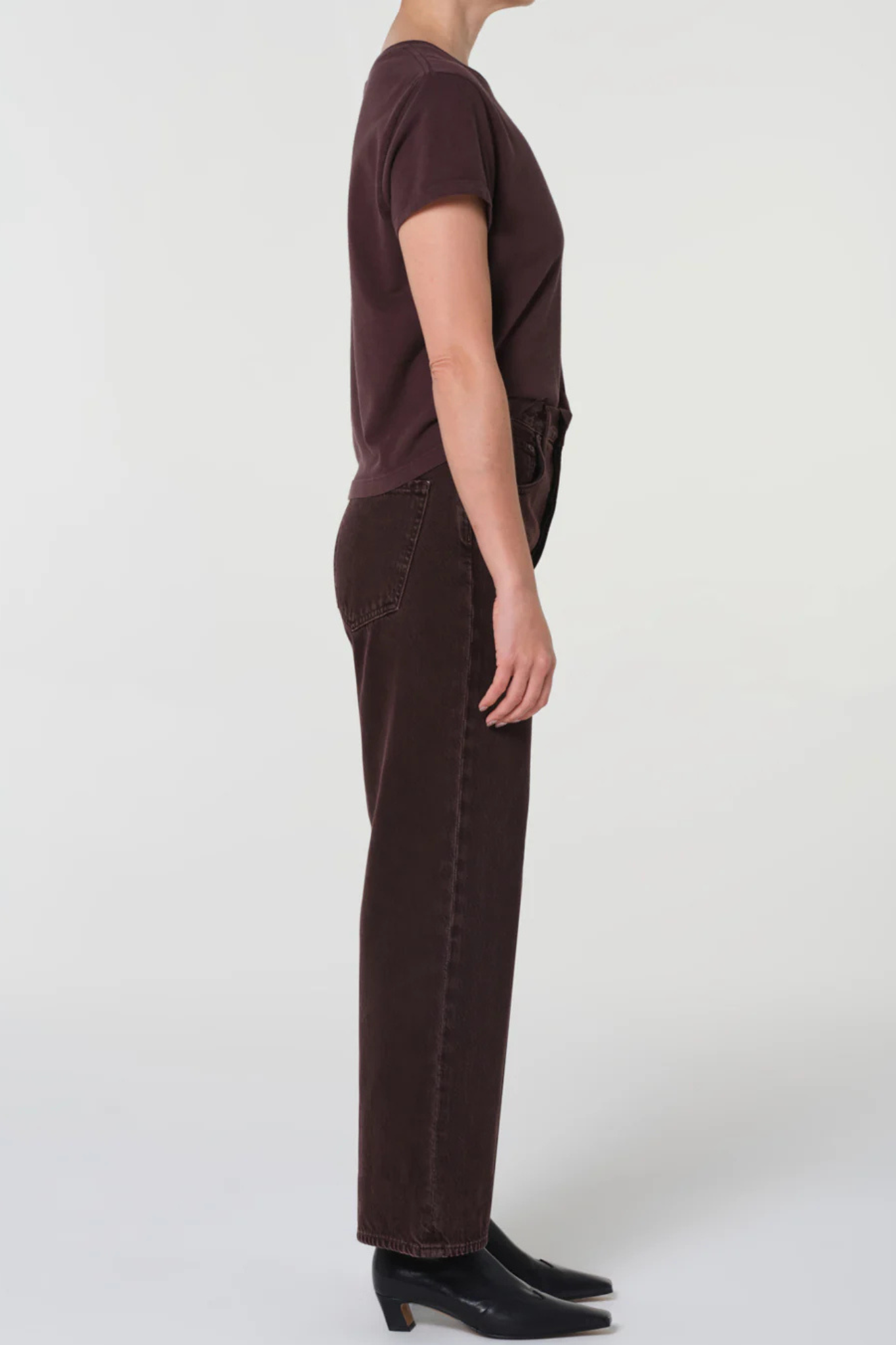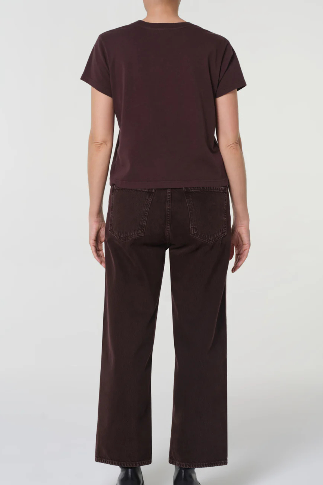 The Ren features a flattering high rise and dramatic wide leg in a 25" inseam. This rigid, non-stretch denim is offered in a rich, dark grape wash with subtle brown undertones and marbling throughout. Style with a crisp tee or tonal knit for a bold, modern look.