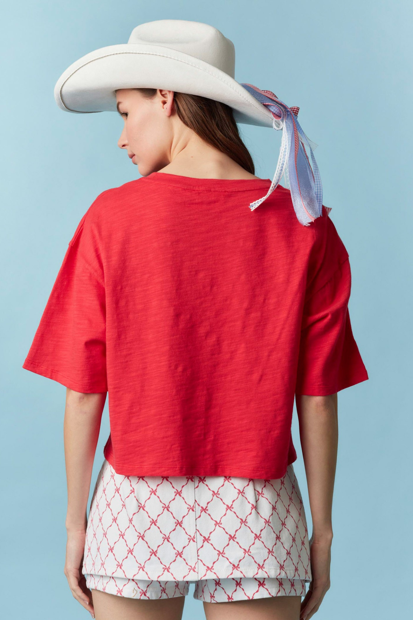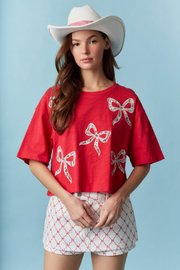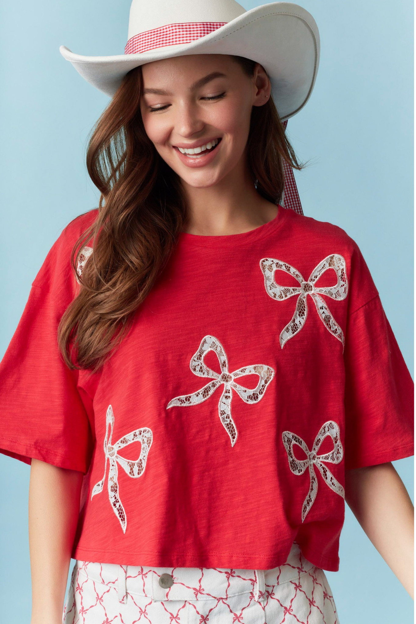 FINAL SALE - bow lace laser cut embo detail cropped short slv top
