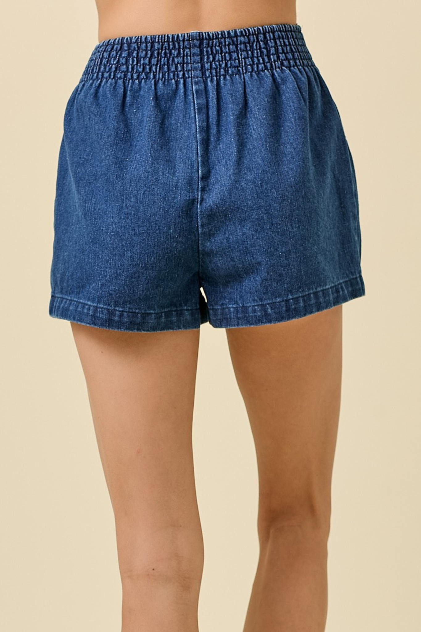 Day + Moon: Tiered Flared Denim Shorts with Smocked Back Waistband and button in medium denim style #: DM2049