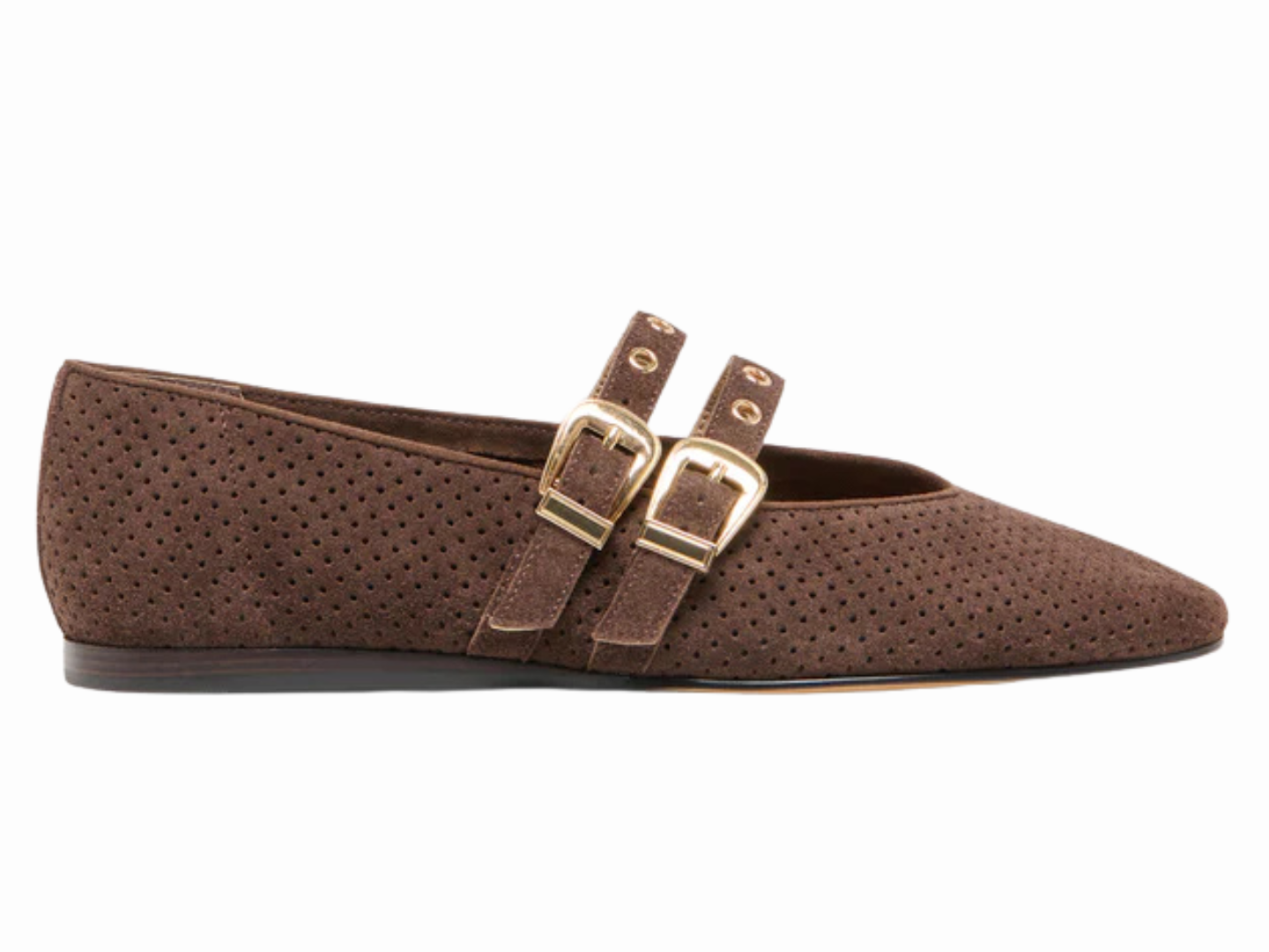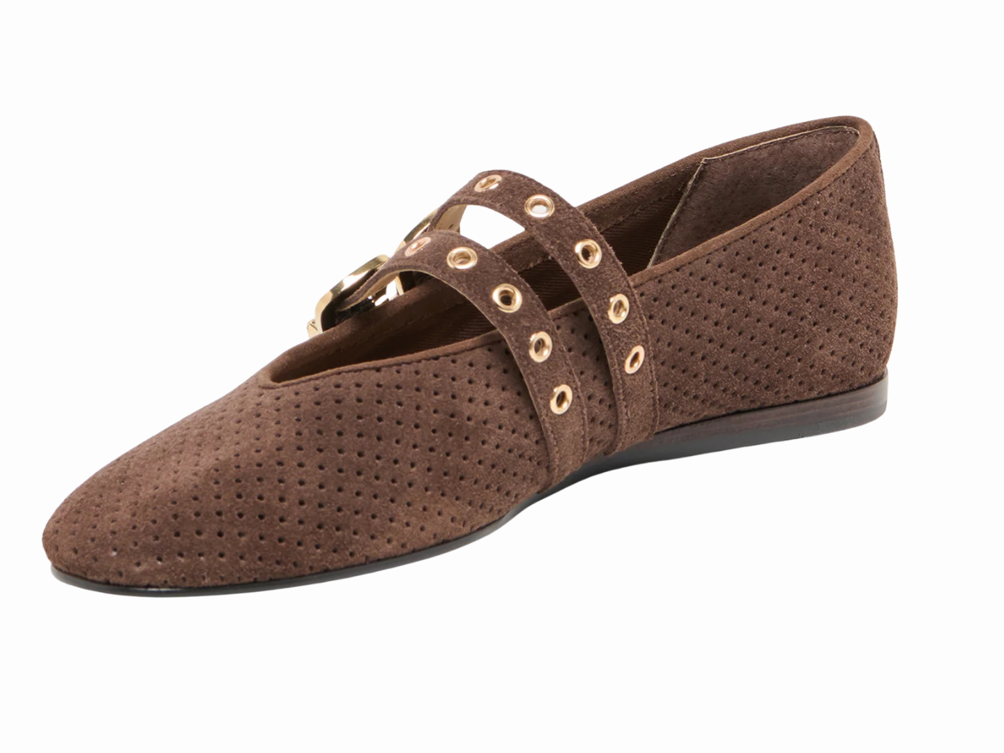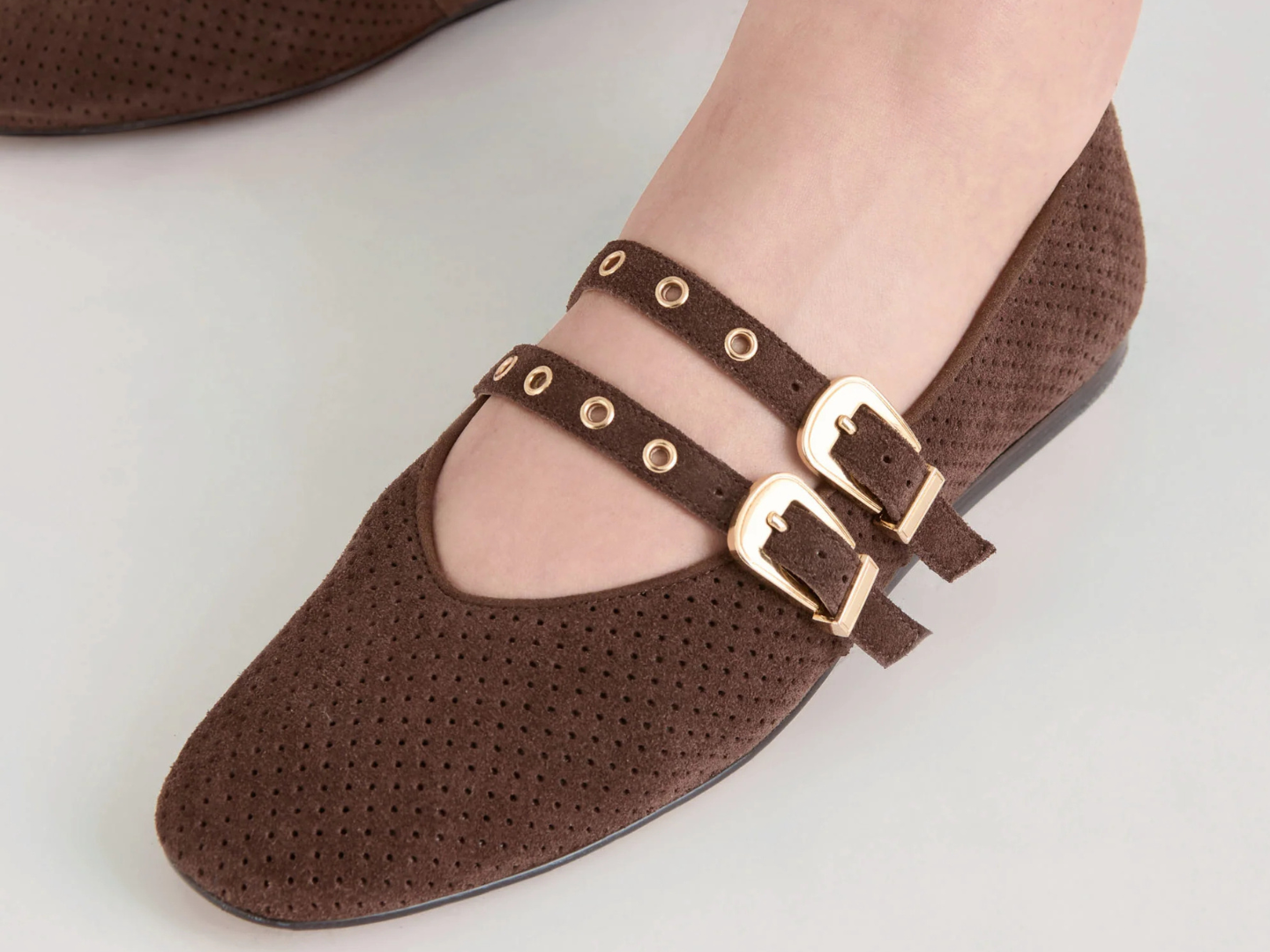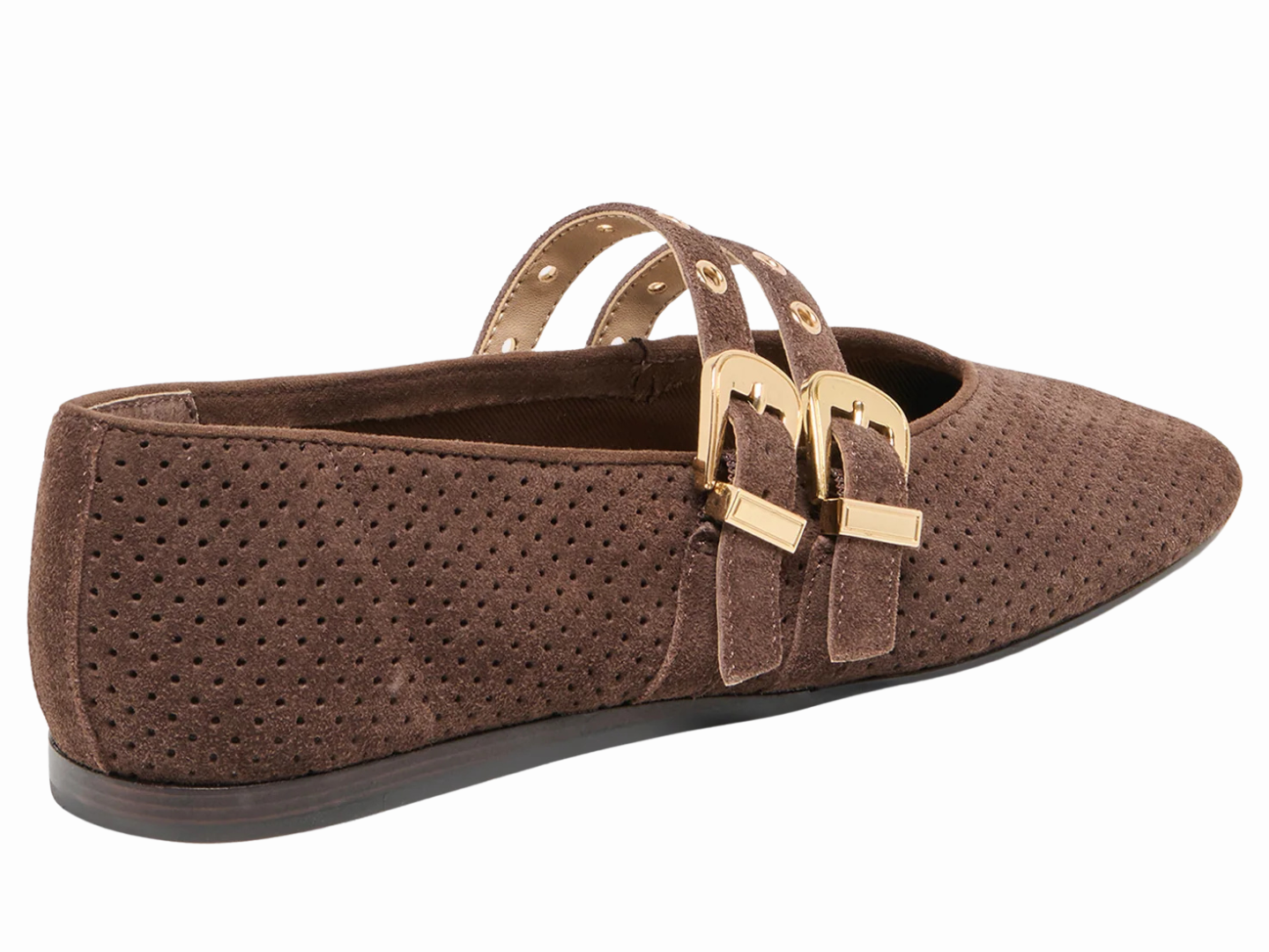 BAYLEE GROMMET makes a statement out of her double strap mary-jane design with gold metal grommets and bold buckles. This sustainably-crafted flat boasts sustainable materials and a bevy of colorways in perforated or printed suede for one on-trend and versatile ballet flat.