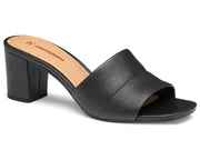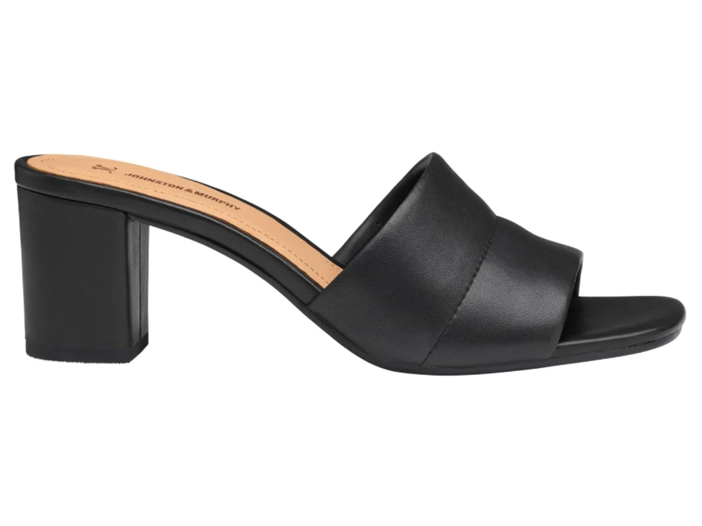 Smooth leather and tonal stitching distinguish a versatile slide sandal grounded by a well-cushioned footbed and modest block heel.