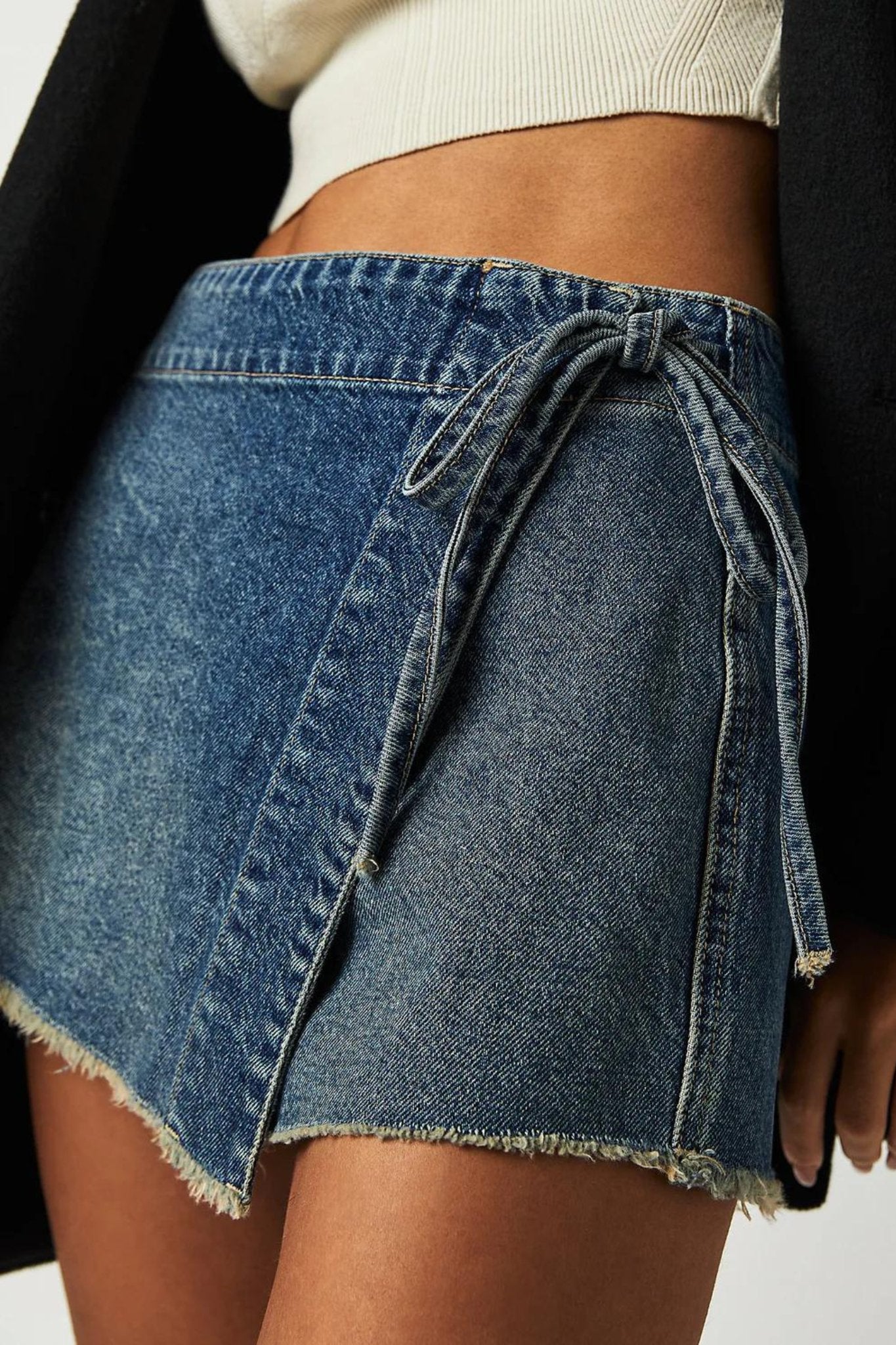 So classic and versatile, this denim mini skort features a side-tie wrap silhouette and asymmetrical design with raw-edge hemline for an effortless touch of edge.