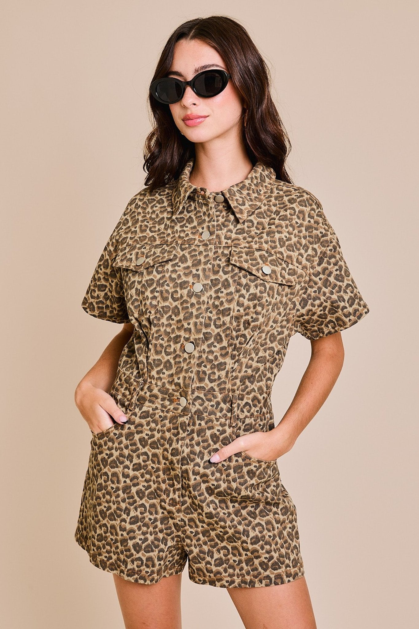 Le Lis: Short sleeve denim romper in taupe-brown leopard style #: SM6657-11