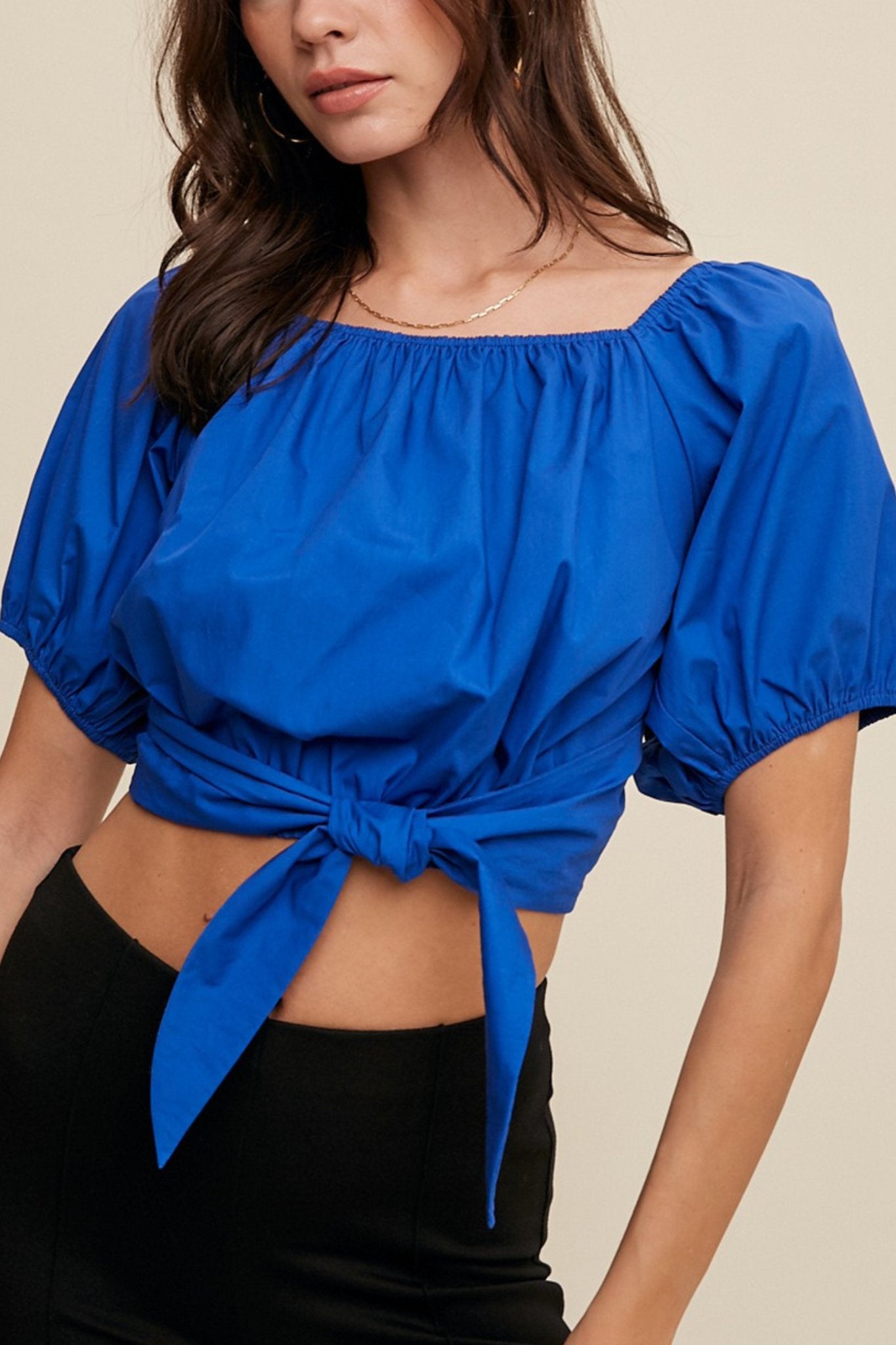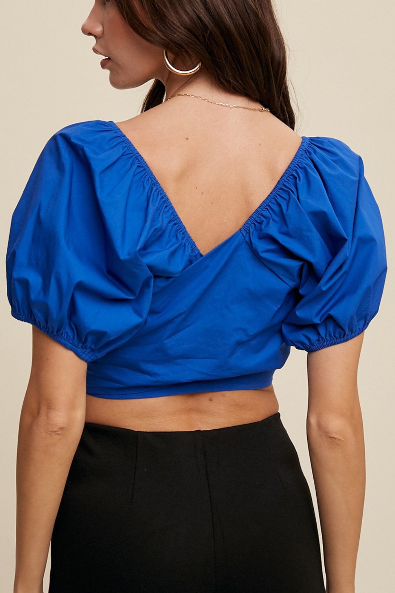 puff sleeve tie back crop top in bright blue Style #: LT1320