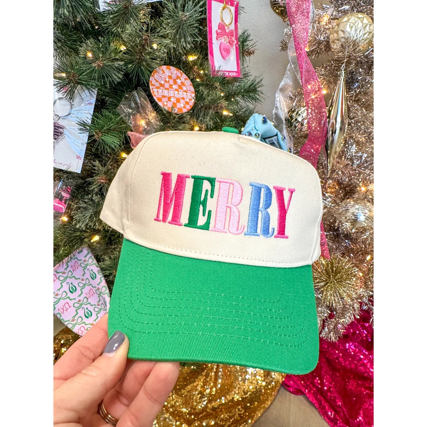 Multicolored MERRY festive hats, just in time for the holidays! These custom hats are embroidered with love in Louisiana!