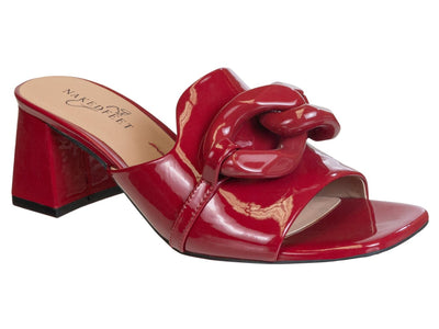 The perfect statement kitten heel for day to night, behold the Coterie in deep red, raising the bar of elegance with a statement chain ornament and modern block heel. With its alluring deep red hue and high-gloss finish, this kitten heel sets a new standard of elegance and opulence.
