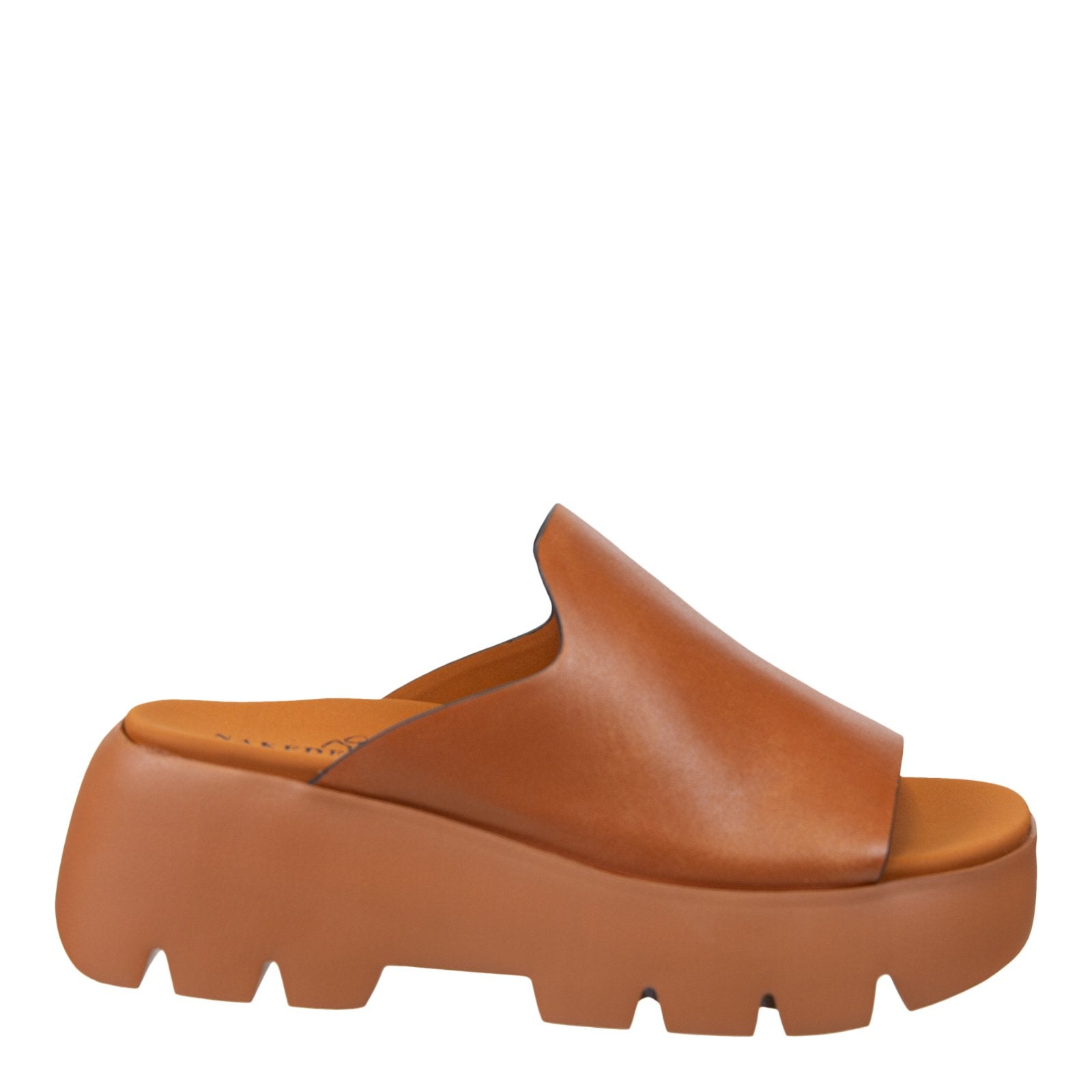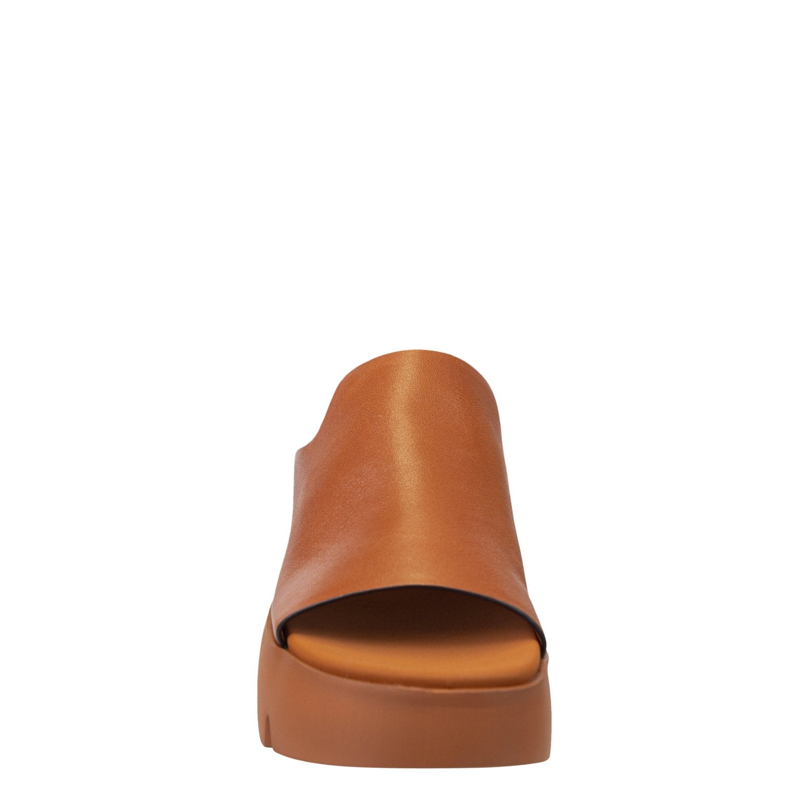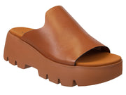 Carmel brown leather platform slides on Naked Feet's all new Fashion Light sole - Drift in camel is the epitome of modern effortless fashion with the most essential silhouette, on an unbelievably lightweight lug sole. Slip on and forget about it, in this casual day-to-night style you can wear to literally just about every occasion. Looking for one pair to wear everywhere? Don't miss your sign.