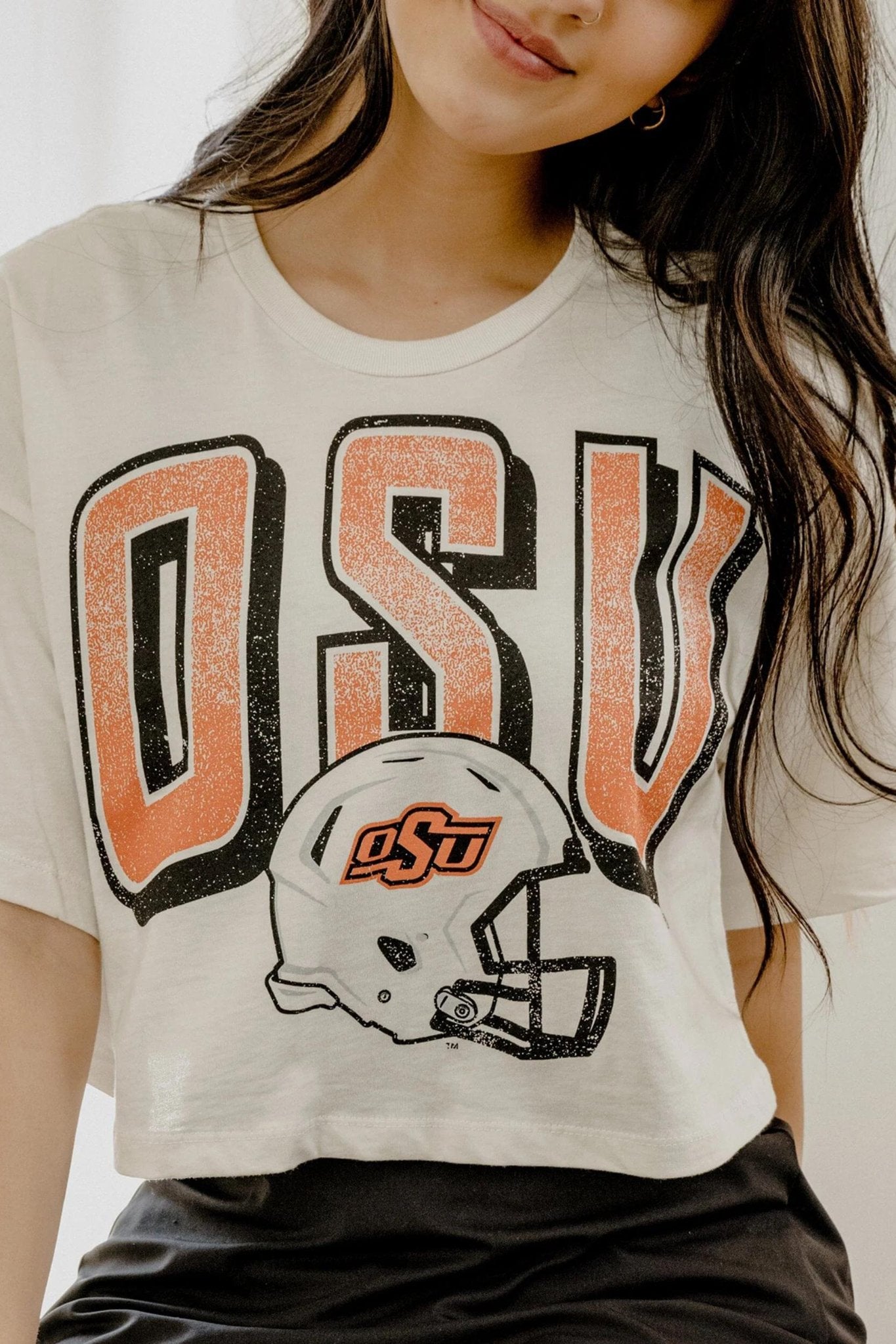 Livy Lu: OSU Cowboys Helmet Fade Cropped Tee in Off White