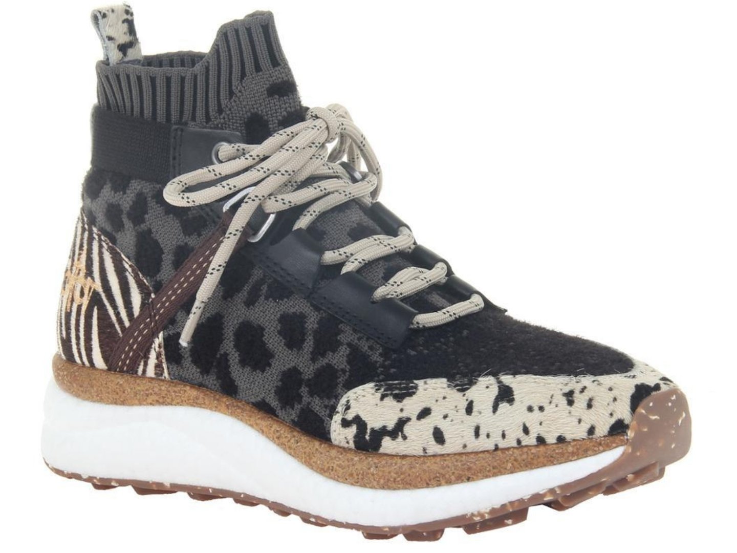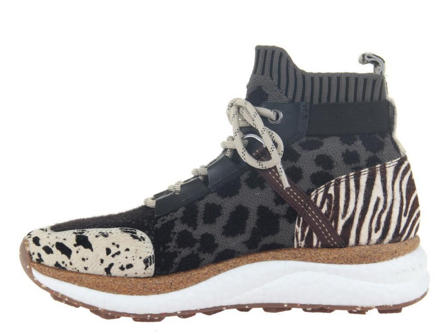 Meet this season's wildest sneaker, with all the cozy vibes you desire. Hybrid in animal print is handcrafted with a soft, stretchy, sock-like high top. Plus, this mix of materials is out of this world. Check the prints, leather embossing and so much texture in every detail.