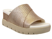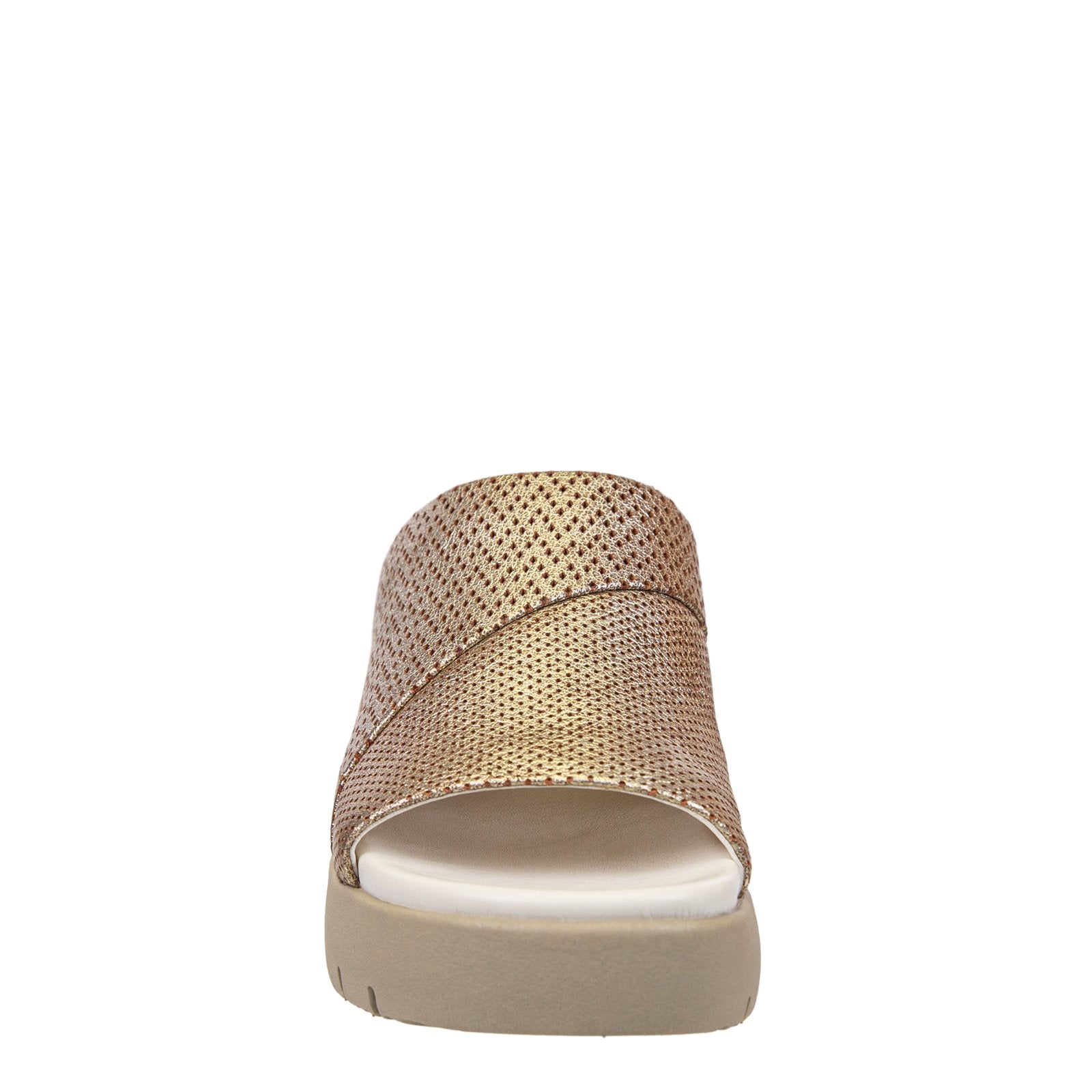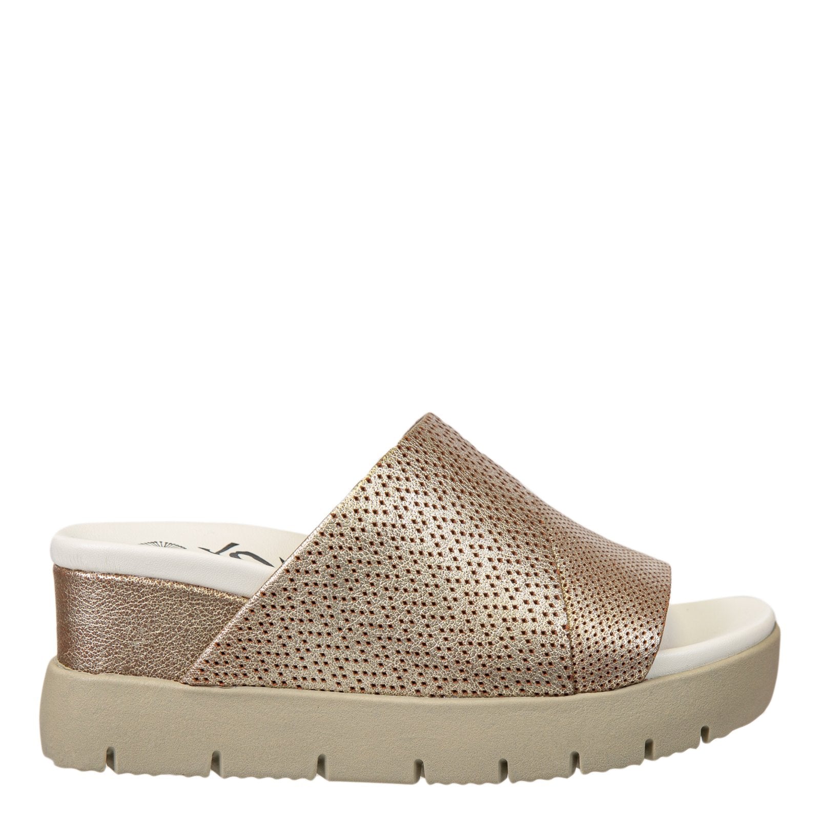 Get a lift in all new metallic comfort platform wedges designed for effortless fashion and an unmatched comfy factor. Norm gold leather slides by OTBT redefine comfort with a feminine slip-on silhouette that gives a generous boost in height while maintaining the perfect balance of platform and traction that were designed to make this style an excellent choice for walking shoes on occasions that require a bit more style than your everyday sandals. Experience what fashion should always be, by OTBT.