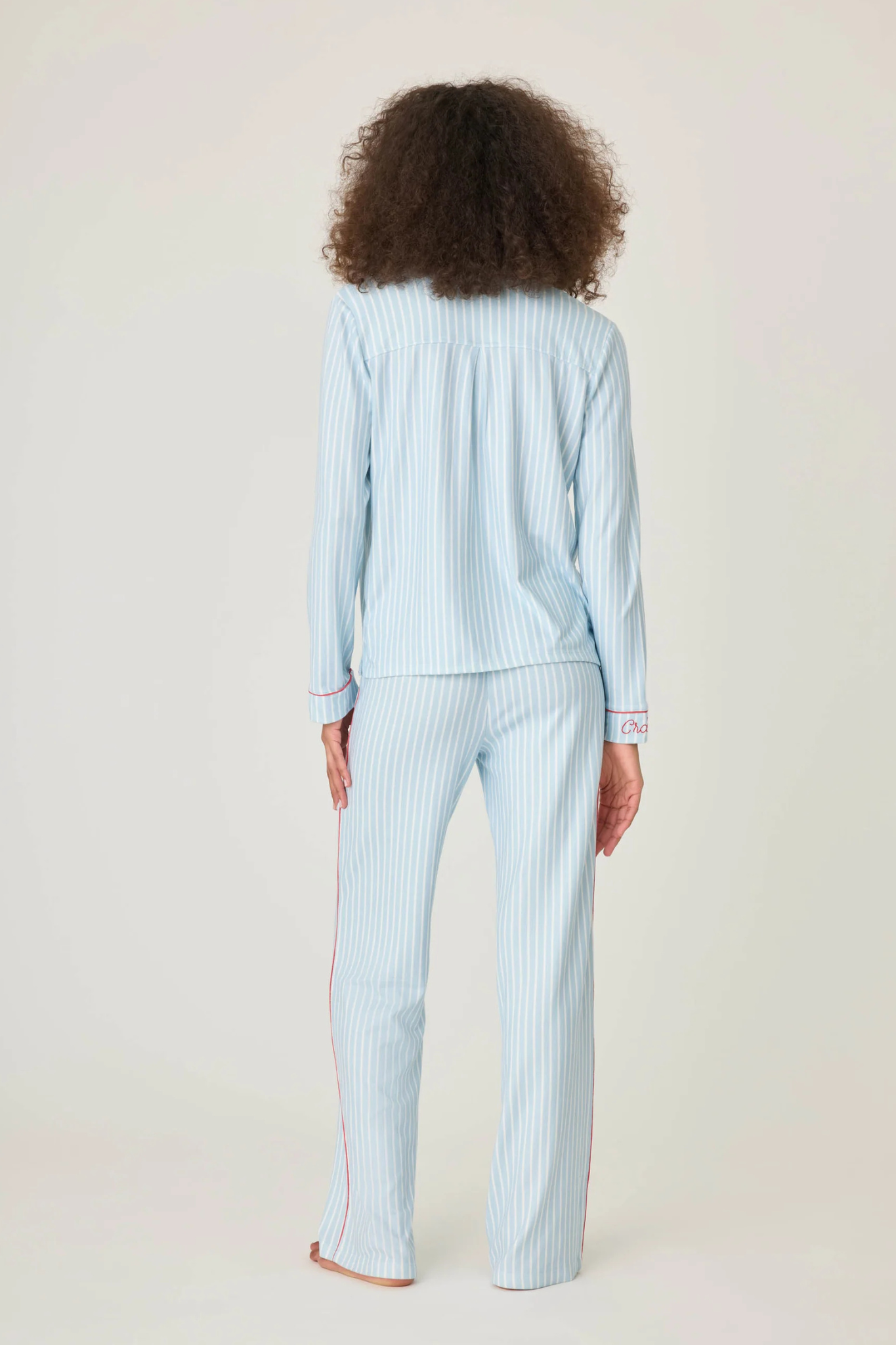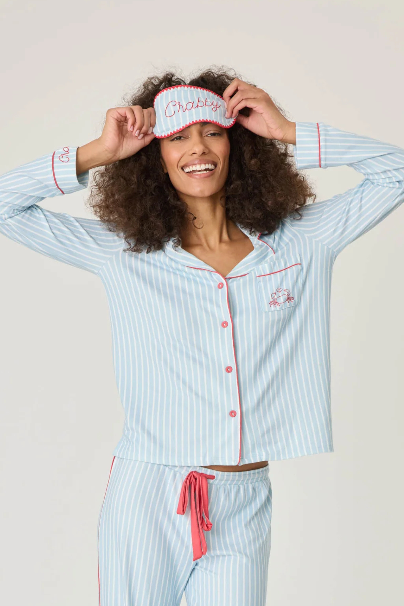 Crab a moment to relax in this playful pajama set. Crafted from ultra-soft butter jersey, the light blue-and-white stripes are as comfy as they are charming. Red piping along the button-front top and side seams adds a pop of color, while the embroidered crab chest pocket and 'Crabby' lettering on the sleeve cuffs give a quirky touch. The matching sleep mask completes the set, perfect for cheekily alerting others to your mood. Whether lounging or drifting off to sleep, this set is all about cozy coastal vibes.