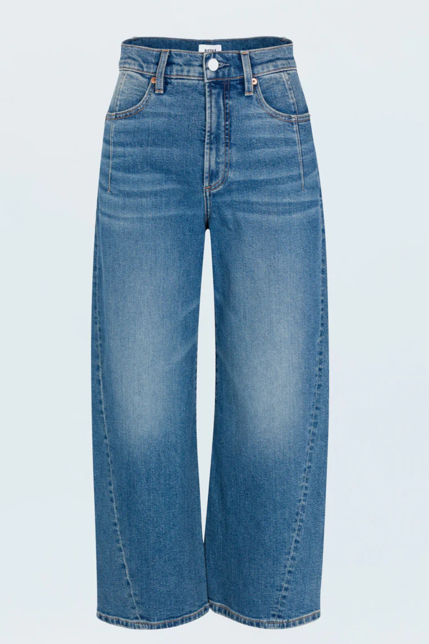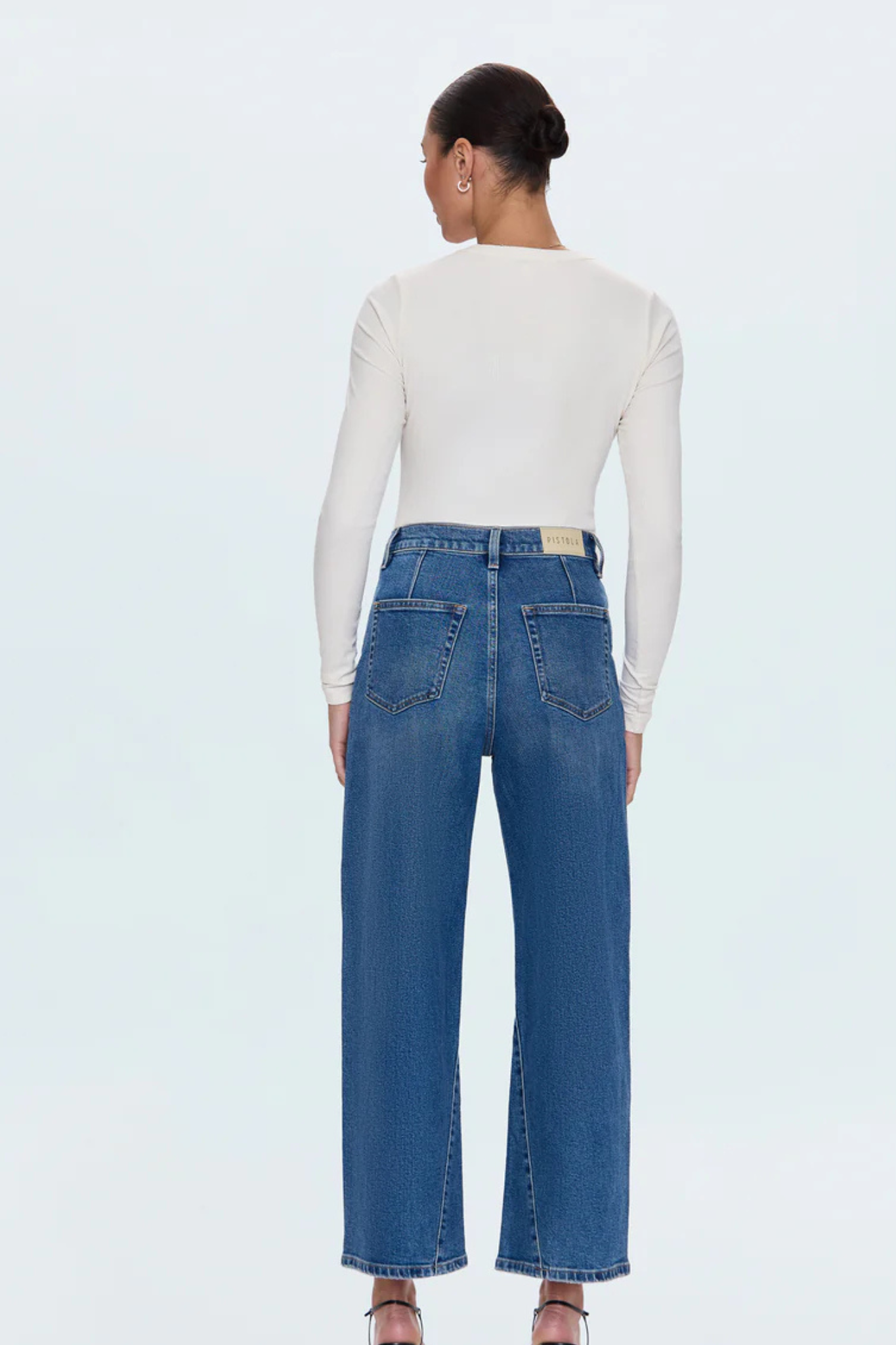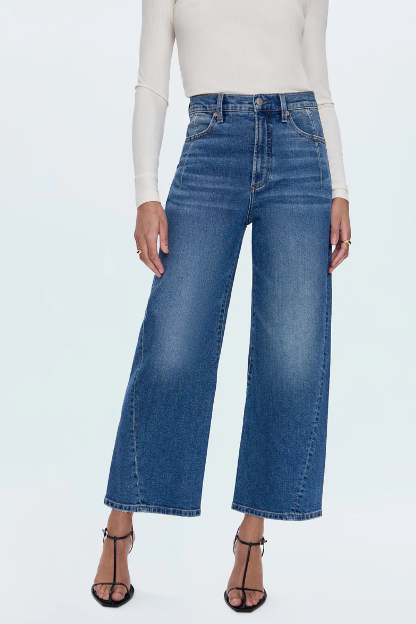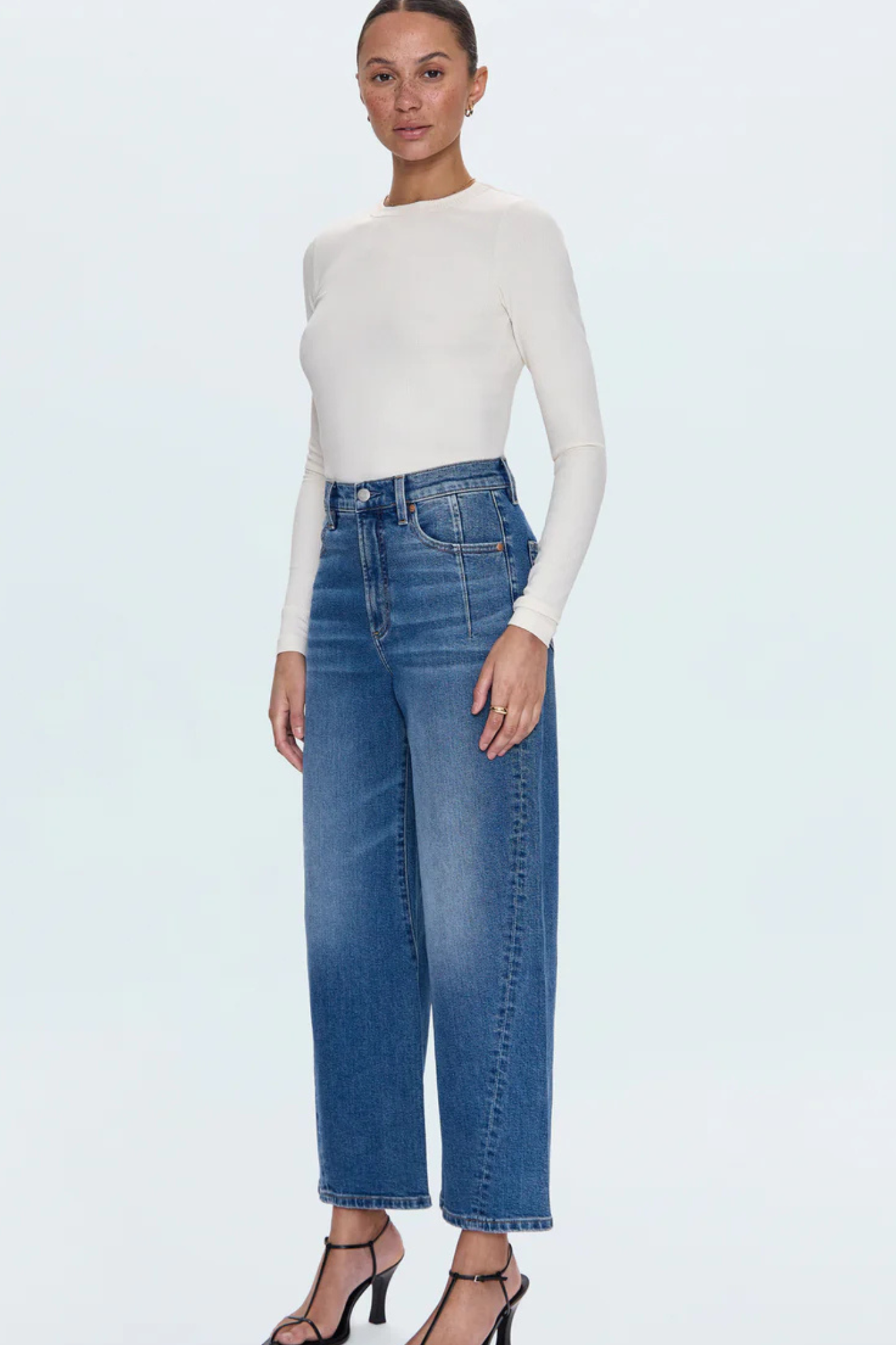The new must-have jean with a twist. Kyra sits confidently at a high rise with our signature bowed leg silhouette and cropped 28" inseam. The subtle curve creates dimension while the wide ankle opening adds modern proportion with a new wide angle for the season. Fashion detail seaming, including a twisted seam that moves forward and yoke seams in the back, brings modern denim classic sophistication. Crafted from our signature comfort stretch denim in Soho, a medium vintage wash with subtle fading that feels both contemporary and timeless
