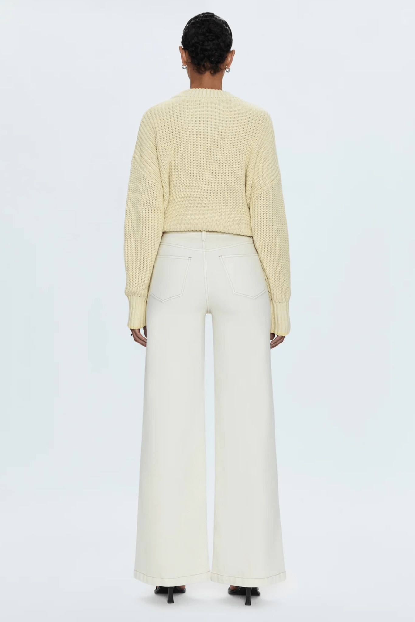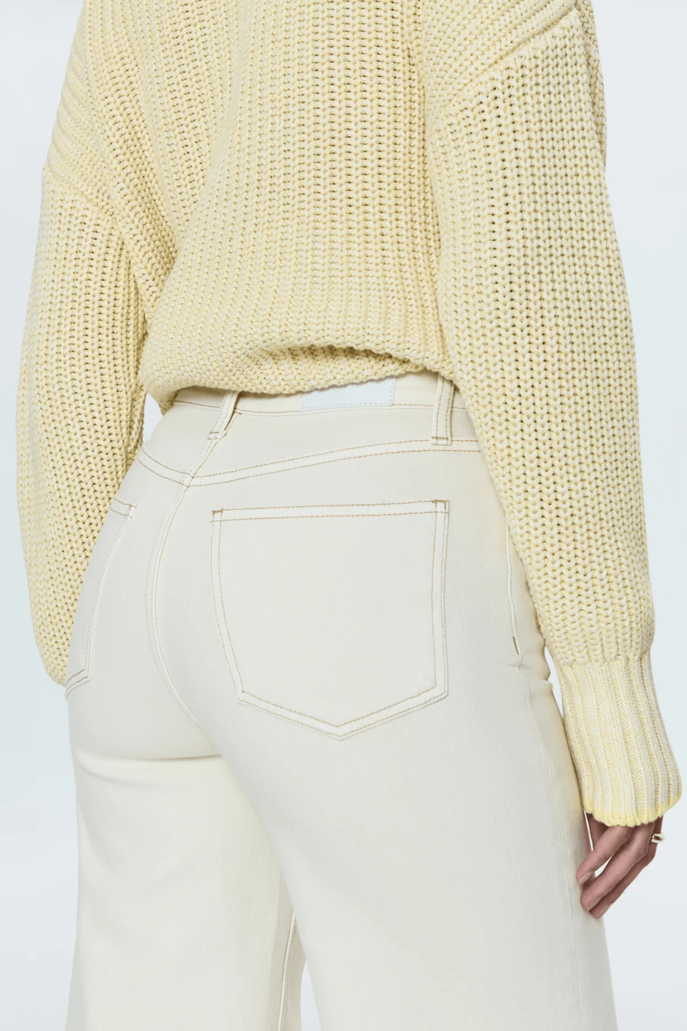 A relaxed, ultra wide leg silhouette featuring a raw finished hem and wide, stitched cuffs. Crafted from our signature comfort stretch denim to provide a structured shape with just the right give. Vivid White is a pure white denim wash with metal hardware finishings.