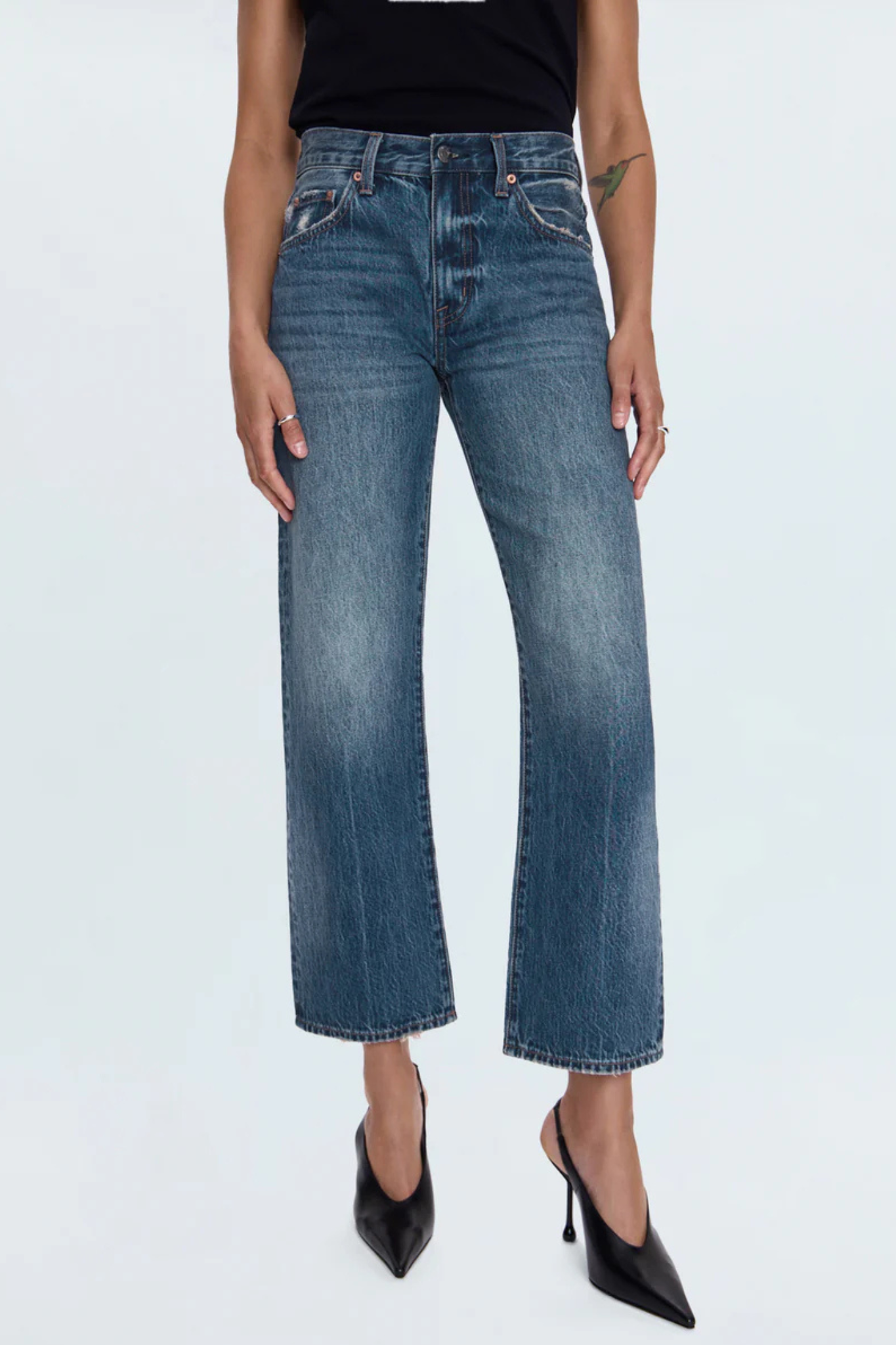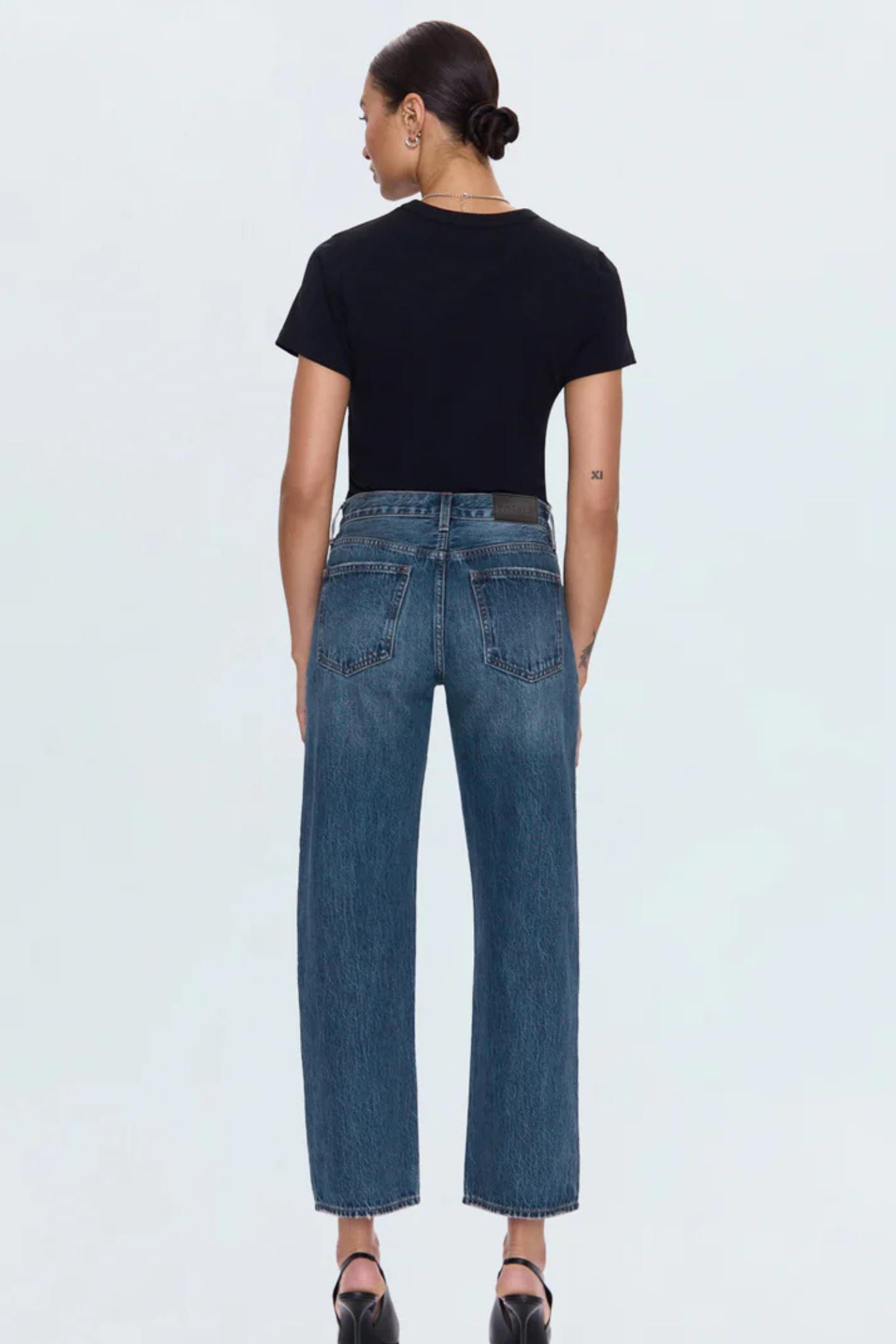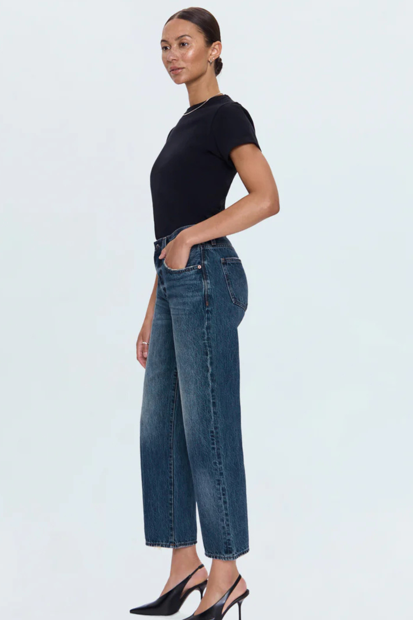 The best-selling jean that understands proportions. Lexi sits at the perfect mid-rise with our signature bowed straight leg, and a subtle curve at the knee that creates dimension without effort. Finished with a 29" inseam, the silhouette tapers to a cropped ankle with a clean hem. Crafted from our rigid denim in Artisan, a rich dark wash with gentle fading around the knees and thighs.