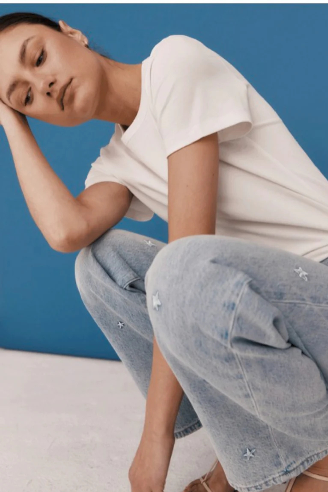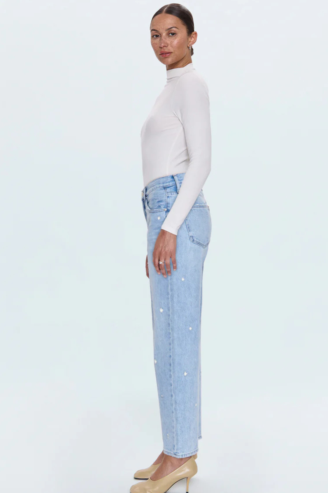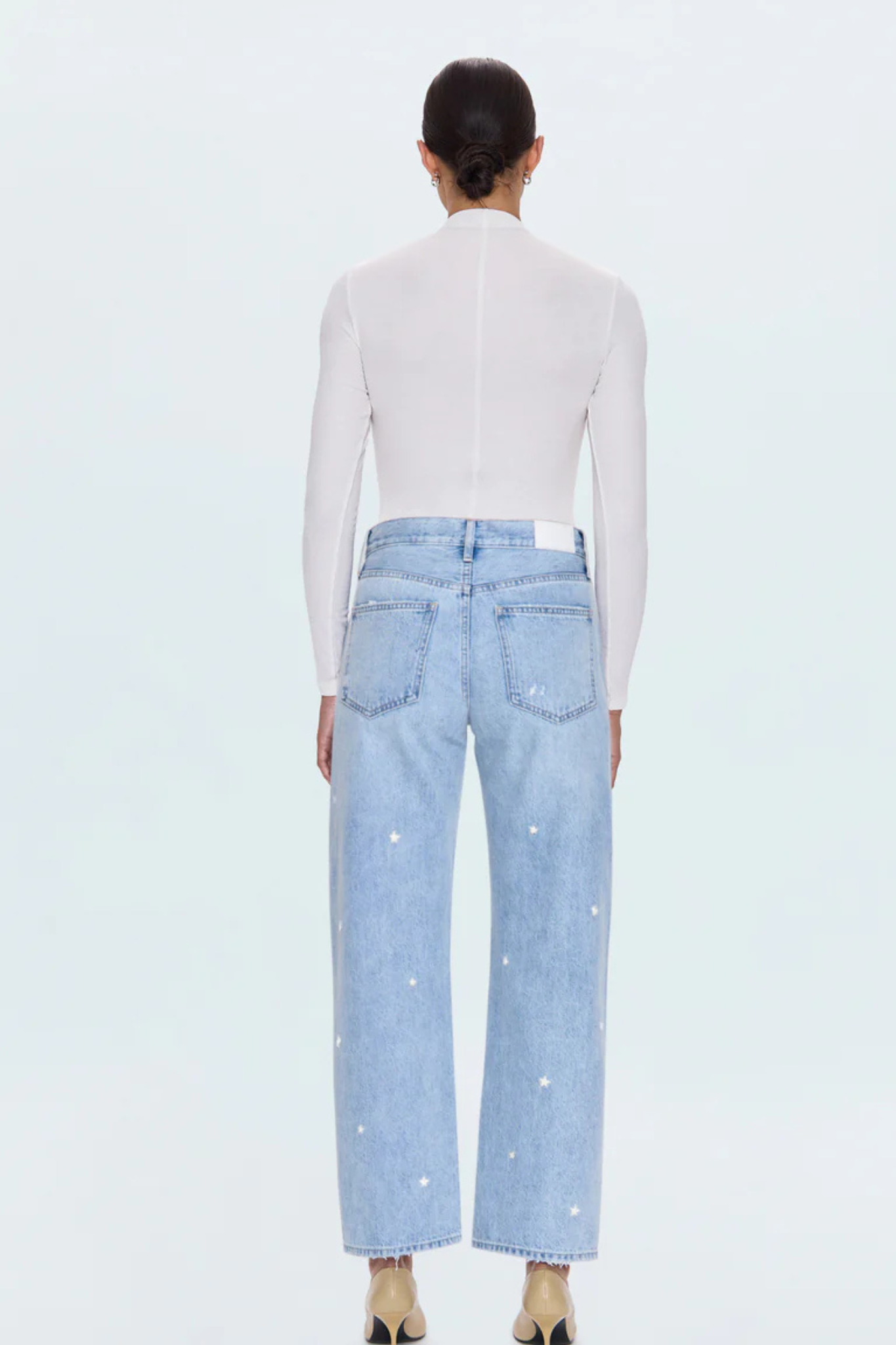 A best-selling silhouette, Lexi sits at a mid-rise with our signature bowed straight leg and a gentle curve through the knee that creates subtle dimension. The cropped 29" inseam tapers cleanly at the ankle, striking the ideal balance of ease and structure. Crafted from rigid denim in Stellar Vintage, a true light blue wash scattered with delicate star embellishments that add a refined, playful touch.