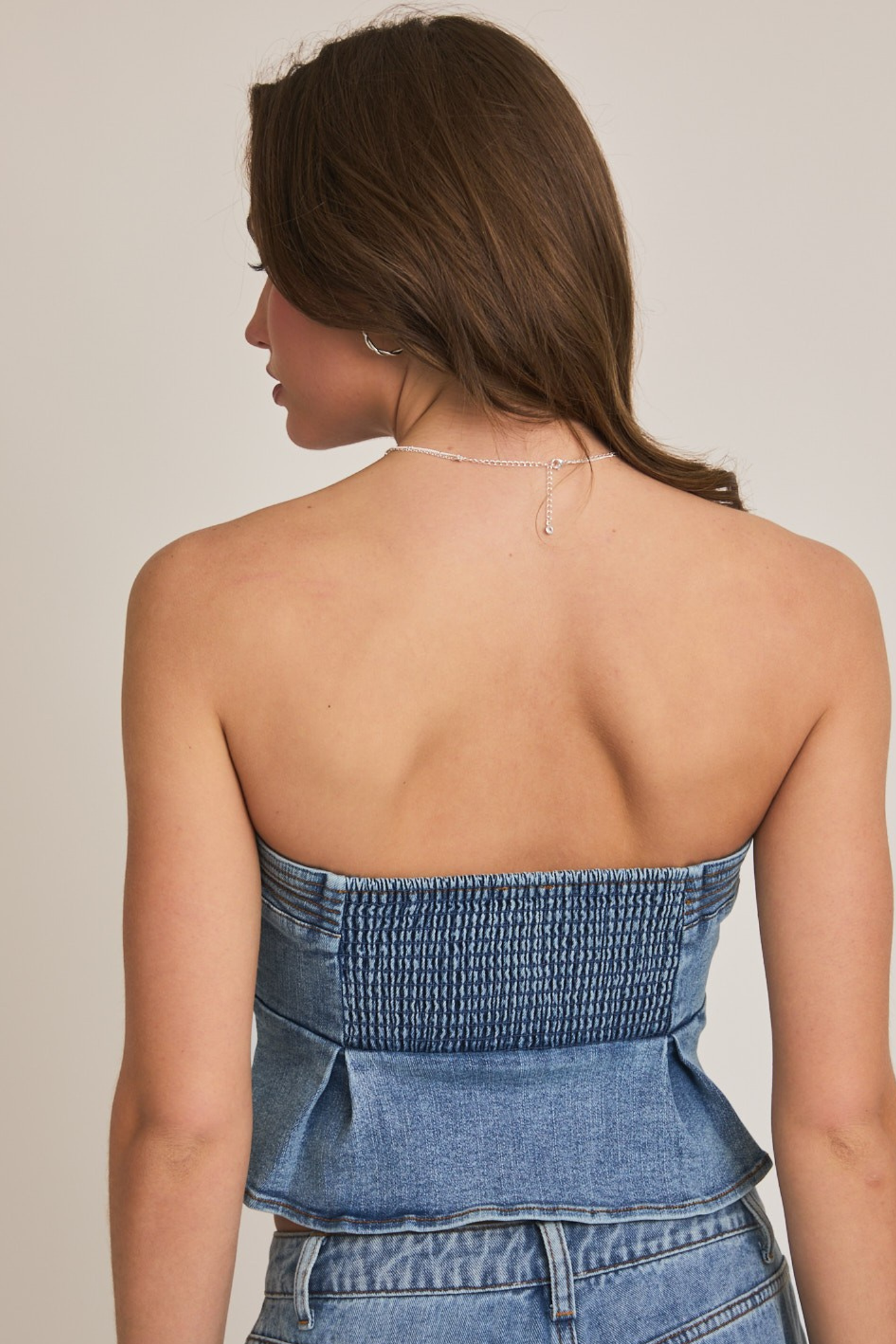 Le Lis: Denim Tube Top With Front Buttons in Washed Black. Style #: PT6009