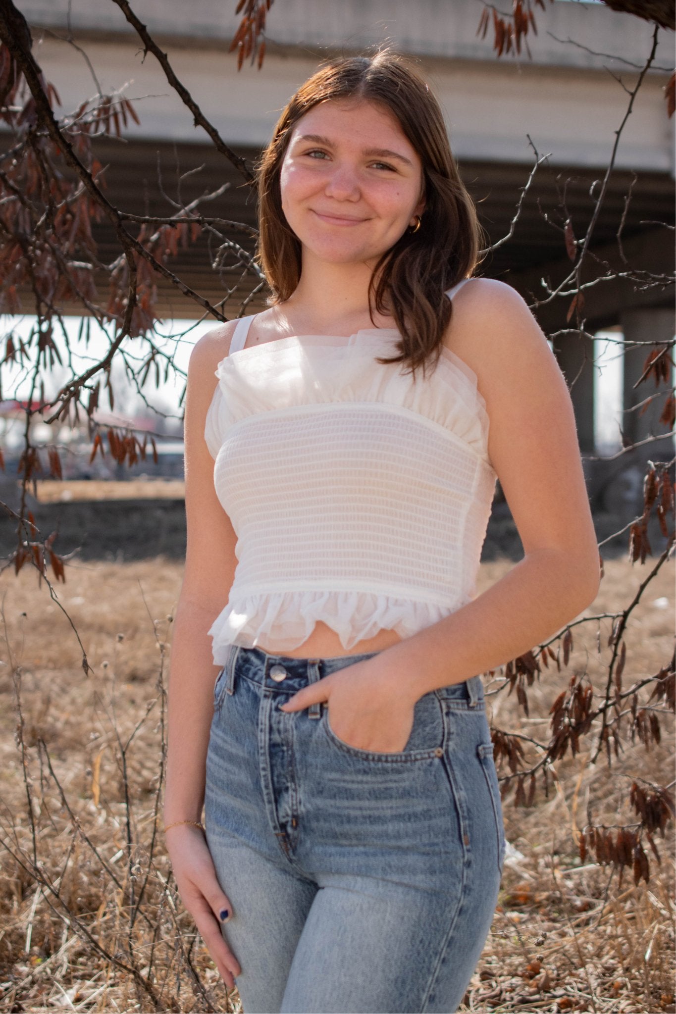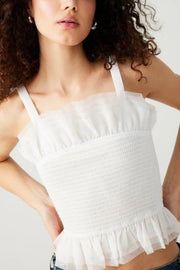 Crafted from delicate tulle, the RHIANNON top showcases a smocked design that adds texture and dimension to this timeless piece. Complete with a whimsical ruffle neckline and hem, this top also features nonadjustable straps for a secure and comfortable fit. The perfect addition to your wardrobe for a touch of elegance.