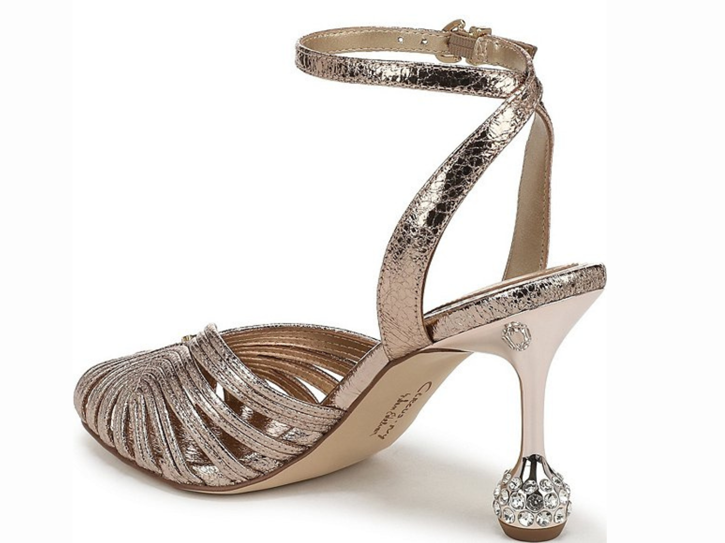 From Circus NY by Sam Edelman, the Giana Crushed Metallic Embellished Heel Ankle Strap Dress Pumps feature: