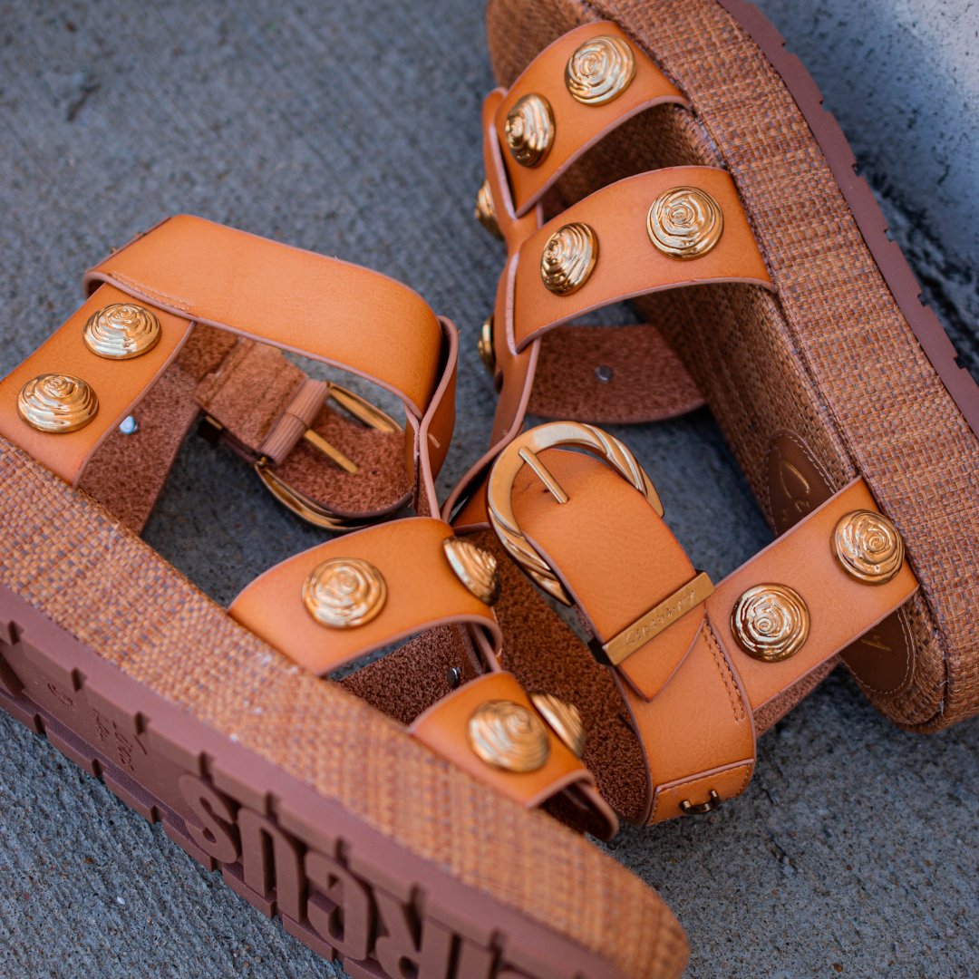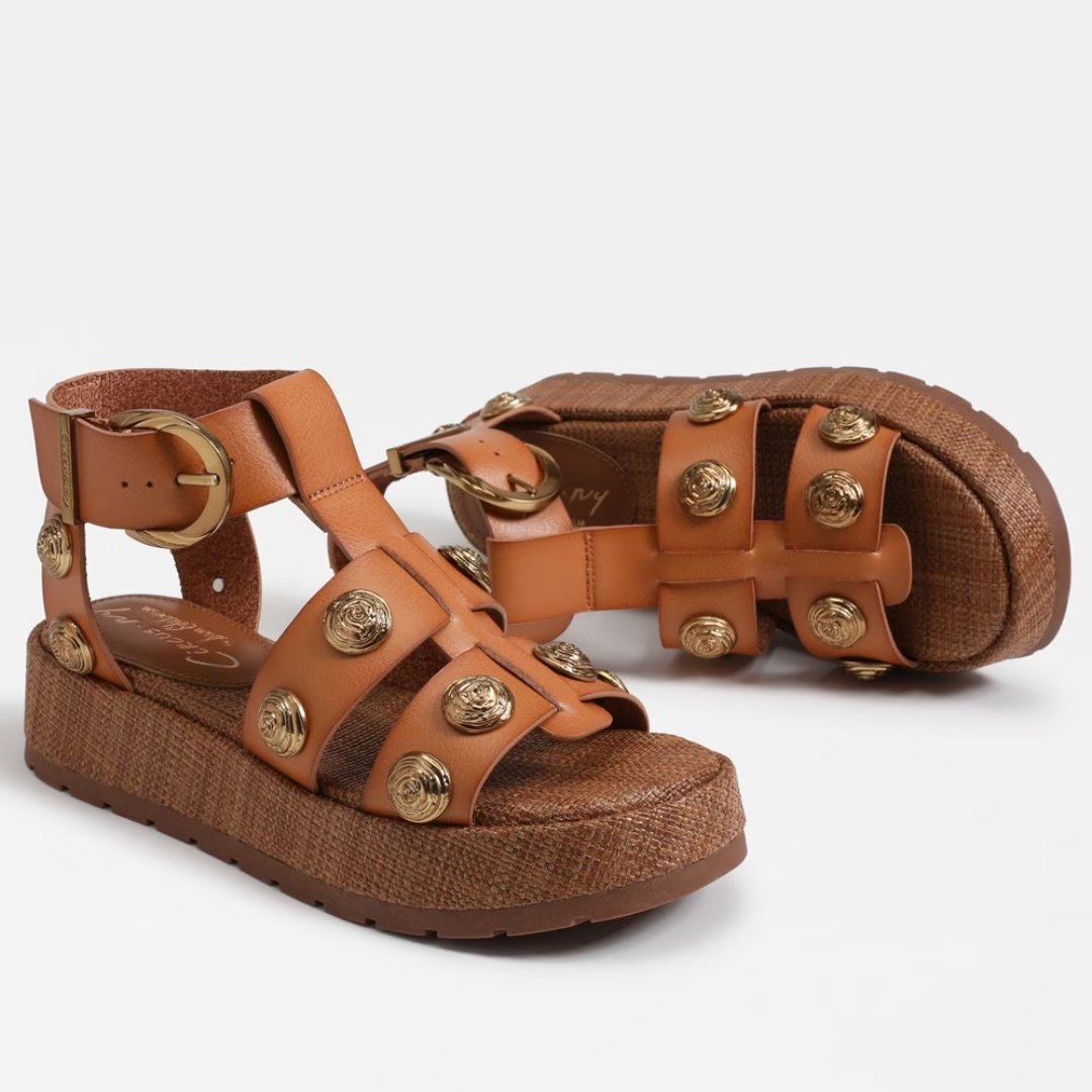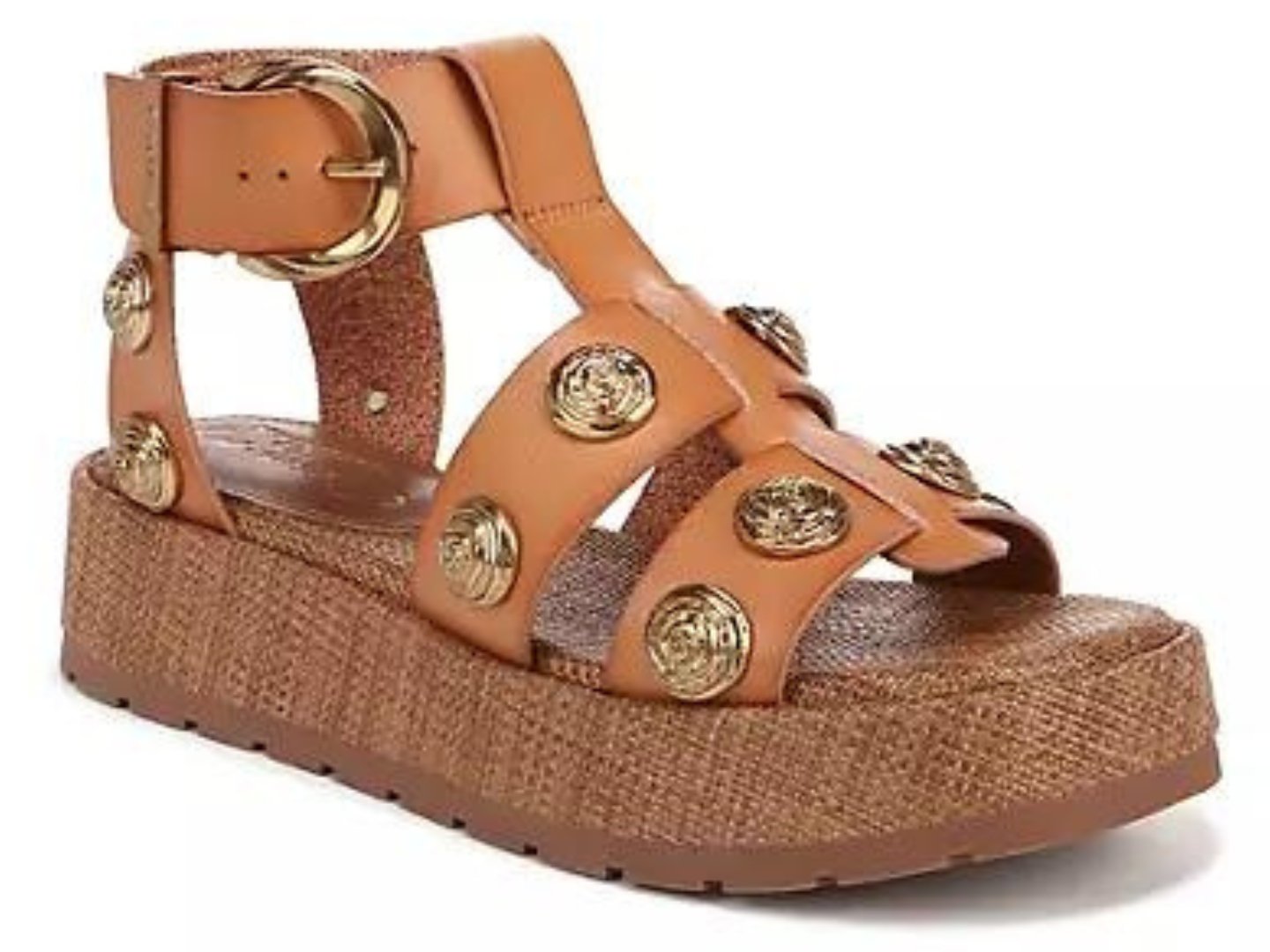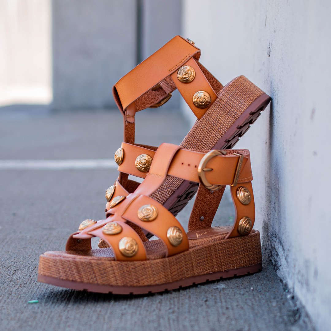 This season's show-stealing gladiator, the Katy, with a comfy textured flatform sole gets some serious hardware. Allover medallion studs have you extra prepped for any fashion battle you may face.