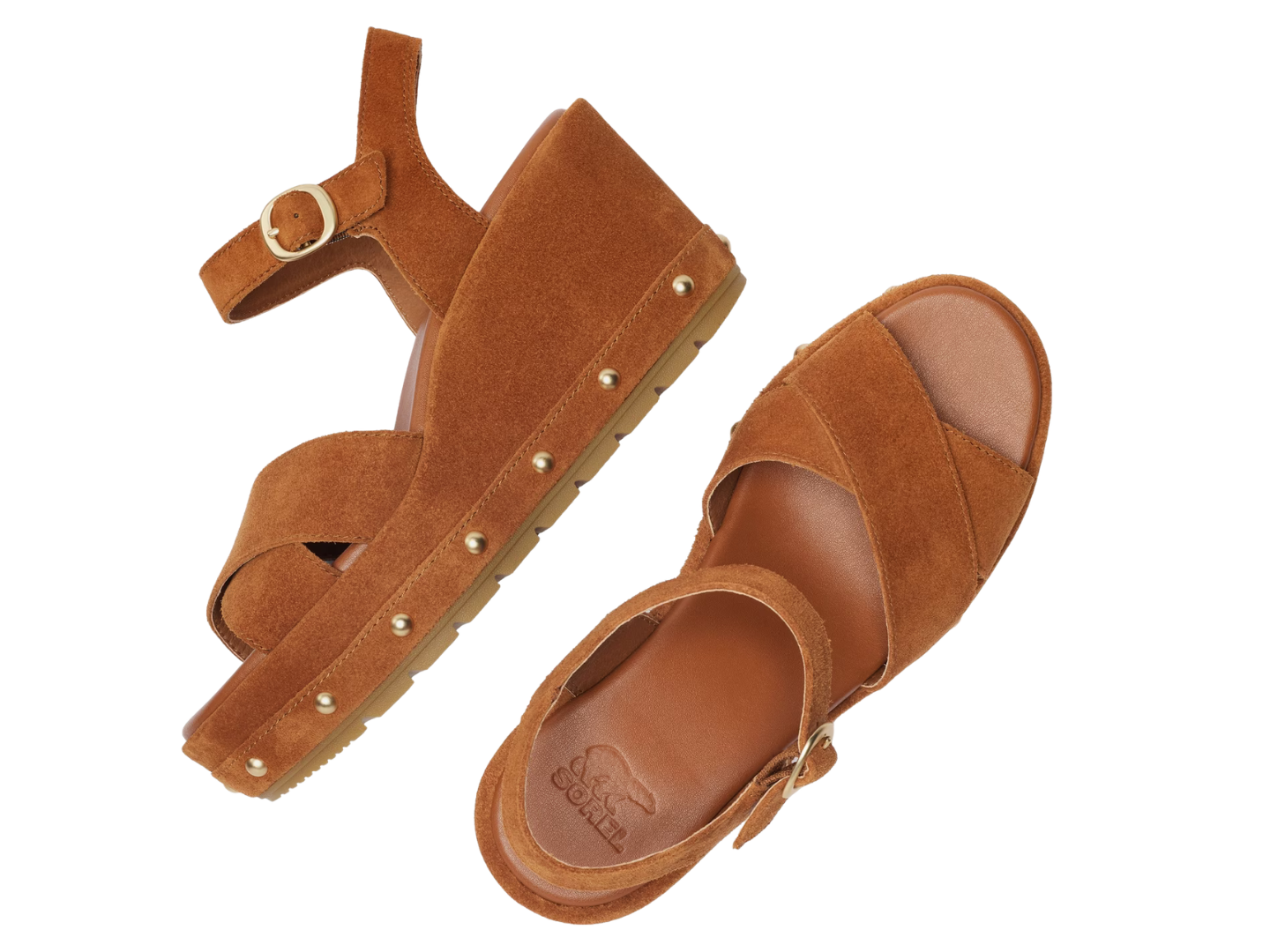 - UPPER: Suede upper. Adjustable ankle strap with buckle closure. Synthetic lining.;INSOLE: Cushioned EVA footbed engineered for underfoot comfort. Synthetic topcover.;MIDSOLE: Suede wrapped wedge. Rivet detailing.;OUTSOLE: Molded EVERTREAD™ rubber.