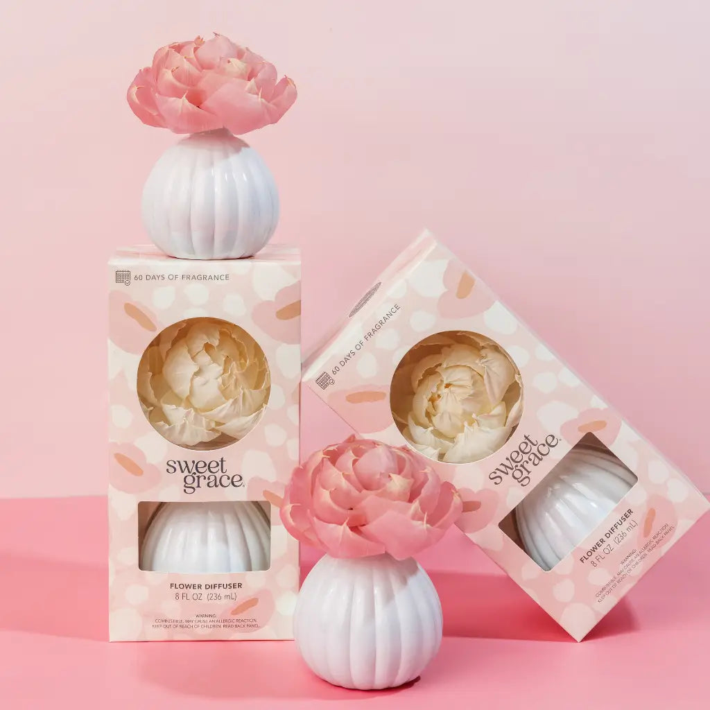 The Sweet Grace Flower Diffuser is our #1 best-selling gift and a customer favorite for every season. Featuring the beloved Sweet Grace fragrance, this decorative diffuser blooms into a soft pink flower over 60 days, making it as beautiful as it is fragrant. A go-to gift for Christmas, Valentine’s Day, Mother’s Day, Easter, birthdays, anniversaries, housewarmings, and everyday gifting, this proven best seller is perfect for front-of-store displays and reliable year-round sales. Sweet Grace is undeniably warm, peaceful, and pure. Notes of passionfruit and apricot blend with sparkling tea, vanilla, caramel, chocolate, and patchouli to create a comforting, unforgettable fragrance that customers love.